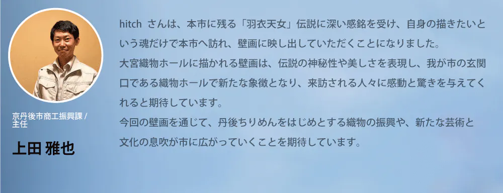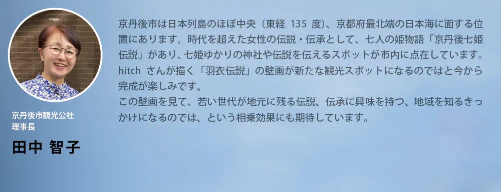 2020年より「羽衣伝説」として知られる物語をテーマとした壁画を描くという企画を進めています。竹取物語の原型とも謂われるこの物語は世界的な広がりを持ち、日本では北海道から沖縄までそれぞれの土地のお話として伝承されてきたようです。