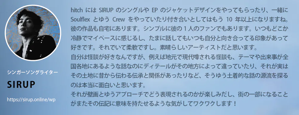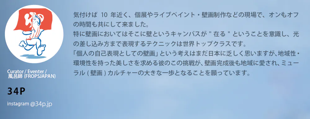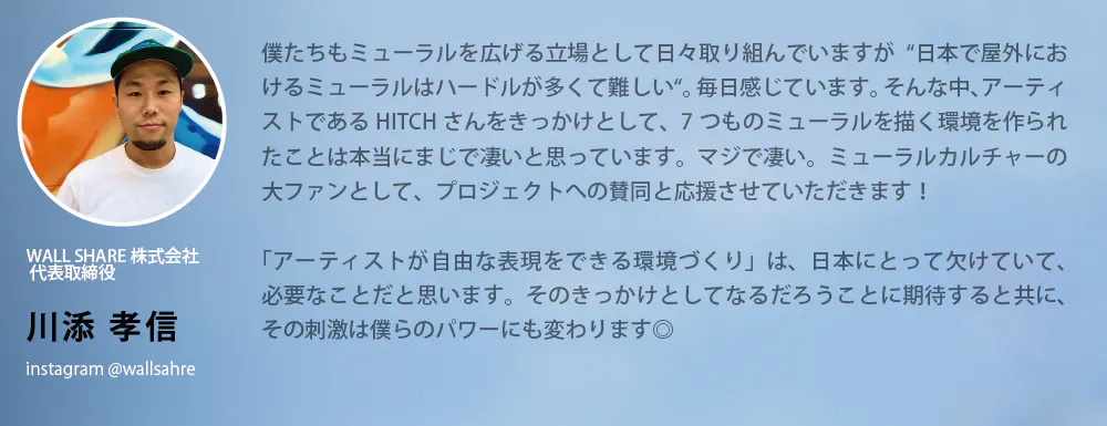 それらに加え、アーティスト主導の壁画を発表する機会が増えることは(それは私たちが歌手や漫画家の心情を昇華させた作品に感動するように)、壁画がより多様で豊かなアートフォームとなる為に重要だと信じるようになりました。