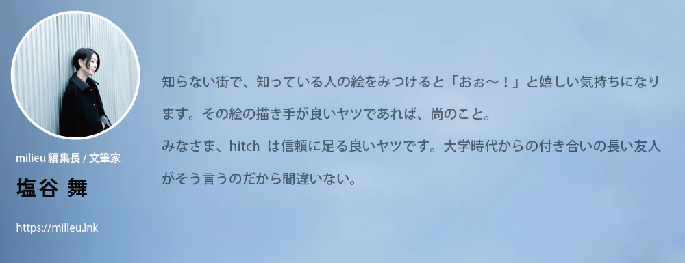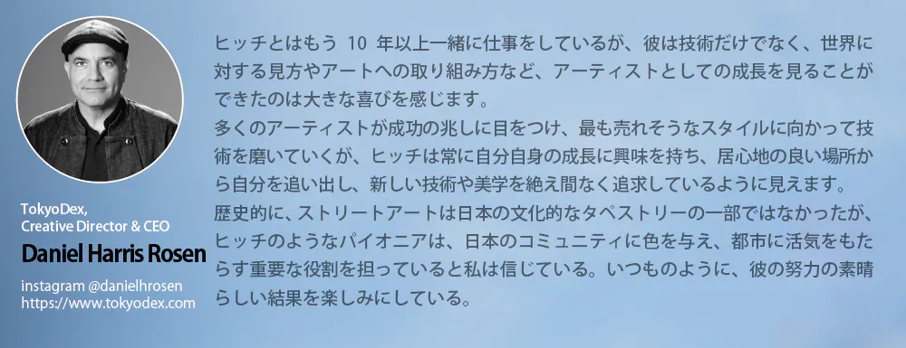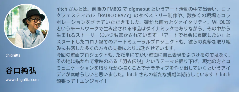 ご覧いただきありがとうございます。私は大阪を拠点にライブペインティング/壁画制作を行うフルタイムアーティストのhitch-ヒッチ-です。これまで15年間にわたって国内外で作品を描いてきました。