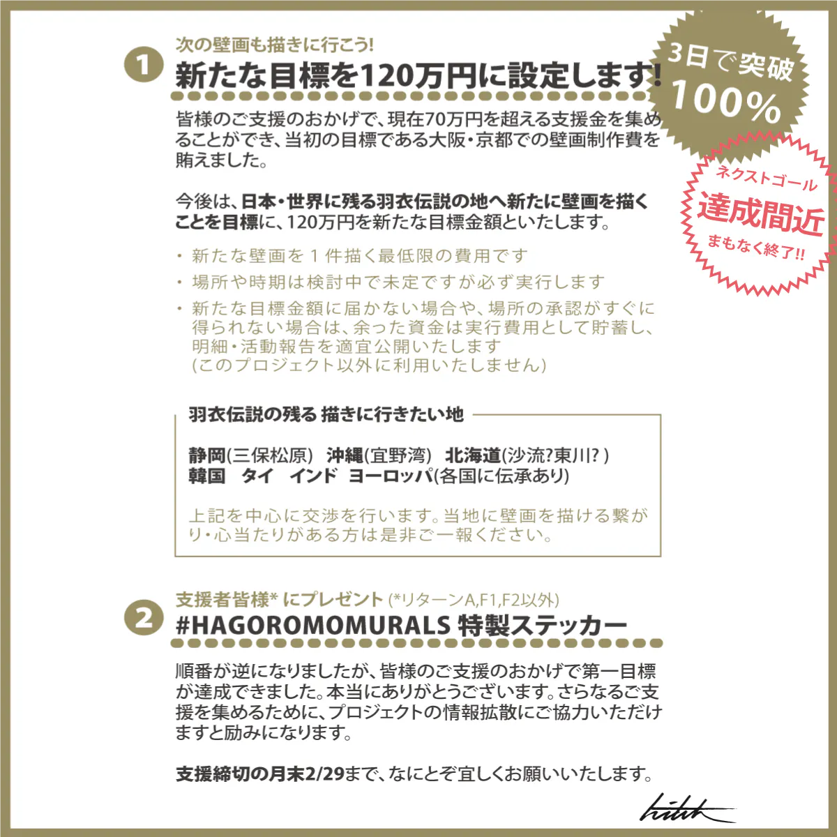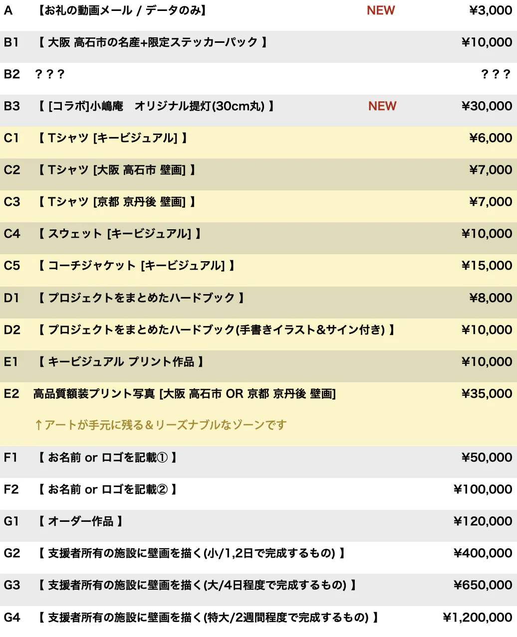 2024/08/11 13:00こんにちは、hitchです!4月の末に2箇所目である京都の壁画を描き終えてから…3ヶ月経ってますね。。。時間を開けすぎちゃってすみません!!なんというか…かなり色んなことがありまして。どこの時点でまとめるべきかと練っているうちに時間ばかり経ってしまっていました。報告ごとが溜まってしまったので、今回の活動報告ではそのまとめとさせてください。最後にインスタライブのお知らせもあるので、ズイッとお読みください。-----お品書き-----[これまで][現状まとめ]・資金面・映像作品[リターンF1, F2]・オーダー作品[リターンG1]・プロジェクトをまとめたハードブック[リターンD1, D2][これから]・壁探し・インスタライブ--------------------[これまで]さて、無事大阪・京都の壁画を描き終えました。これもホント一重に、サポート頂いた皆様のおかげです。制作中にお立ち寄りいただいた方やメッセージをくれた方、完成写真にタグ付けしてくださった方々、励みになりました、本当にありがとうございます。壁画は今後も残りますので、是非現地の雰囲気とセットで壁画を体感してみてください。[現状まとめ]・資金面¥1,373,500支援総額¥1,102,500経費合計¥271,000支援残高支援総額の80%を消費して、残りは27万円となりました。経費の内訳はこちらです。¥337,629返礼品¥41,976制作費¥445,963外注工賃¥27,964交際費¥230,983旅費交通費¥17,985会議・宣伝費¥1,102,500合計制作費が異常に安いのは、塗料で協賛してくださったタカラ塗料さん、スプレーヤーを提供してくれたワグナーさんのおかげです。また旅費交通費や外注費(足場やアルバイト代)については、合計30日近い制作日数では多くかさみました。(そこでの嬉しい出会いもあったので良い思い出です)自分は結構倹約家だと思うし、周りが協力してくれたおかげで、壁画3枚にしてはかなりセーブ出来た方だと自負してます。が、100万円もの大金を使っている事に驚きますね。。次からはこれからの提供となるリターンについてです。・映像作品[リターンF1, F2]こちら提供が遅れてしまい申し訳ありません。想定より羽衣伝説について深く知れ、素材が沢山出来たので7月中のリターンに間に合いませんでした。プロジェクトムービーについては年内の公開を目指して制作中ですが、ひとまずは制作のドキュメンタリームービーを今月半ばに公開いたします。8月18日公開予定プロジェクトムービー年内公開予定ドキュメンタリームービーなお映像制作はdohakuに依頼しているのですが、プロジェクトへの共感から制作費を無償で作ってくれており、支援金からの支出はありません。本当に有難い限りです。。もう少々時間がかかりますが、その分ハイクオリティですので、どうか楽しみにお待ちください。・オーダー作品[リターンG1]こちらはご支援者へは連絡済みですが、予定通り鋭意制作中です。壁画もそうだけど、そこからキャンバスに興味を持ってもらえるのは嬉しいですね。私事ですが年内はバタバタ(またお知らせしますね!)でして、合間を縫いながらちょこちょこ制作しています。。年内間に合え〜、、・プロジェクトをまとめたハードブック[リターンD1, D2]こちらもビシバシ作ってます!現在は写真の選定を終え、原稿を作っている段階です。支援者が多いので作り甲斐がありますね。楽しみにお待ちください。リターンについては以上です。その他のリターンは全て提供済みのはずですので、なにかご不明点があればお問合せください。[これから]まだ未定な部分も多いんですが、現時点での展望をお話しさせてください。・壁探し手間取ってます!笑沖縄か北海道に絞って、協力者を頼りながら描ける壁を探しているのですが、候補地が浮かんでは消えを繰り返しています。CYCの時から慣れてるとはいえ、描ける場所を遠隔で見つけるのはハードルが高いですね。。もはや定型分ですが、沖縄か北海道にお知り合いがいて、壁のツテが得られそうでしたら是非ご一報ください!ワンチャンス(略さない)海外ルートも常に頭になるので、財布と相談しながらトライするのも狙いたいですね。・インスタライブさて、さらりと全体をなぞってきましたが、インスタライブのお知らせです。思えば壁画を完成させてから一度もオンラインでお披露目会が出来てませんでした。それに、活動報告では書きづらいこともあったりして(実はそれが原因で一時期落ちてたりしたんですが)、今ならうまく皆さんに伝えられるかなって。大阪・京都での制作振り返りもしつつ、上述したドキュメンタリーの同時視聴も合わせて、下記日程で行いますので、ビール片手にお楽しみください。8月21日(水) 21時よりigアカウント@hitch_w9 にて-----さてさて、今回は以上です。最近は嵐の前の静けさって感じで、ほんっと人里離れてこもっておりました。秋からは里に降りてウホウホする企画がノンストップなので、どうぞよろしくお願いします! もっと見る