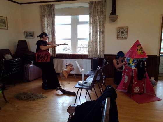 窓から緑と羊達(時々ピーターラビットも)見える気持ちのいいホールに6名9作品がひしめいていました。途中で2時間ほど、ペープサート(うちわ型平面紙人形劇)のワークショップもやらせていただきました。