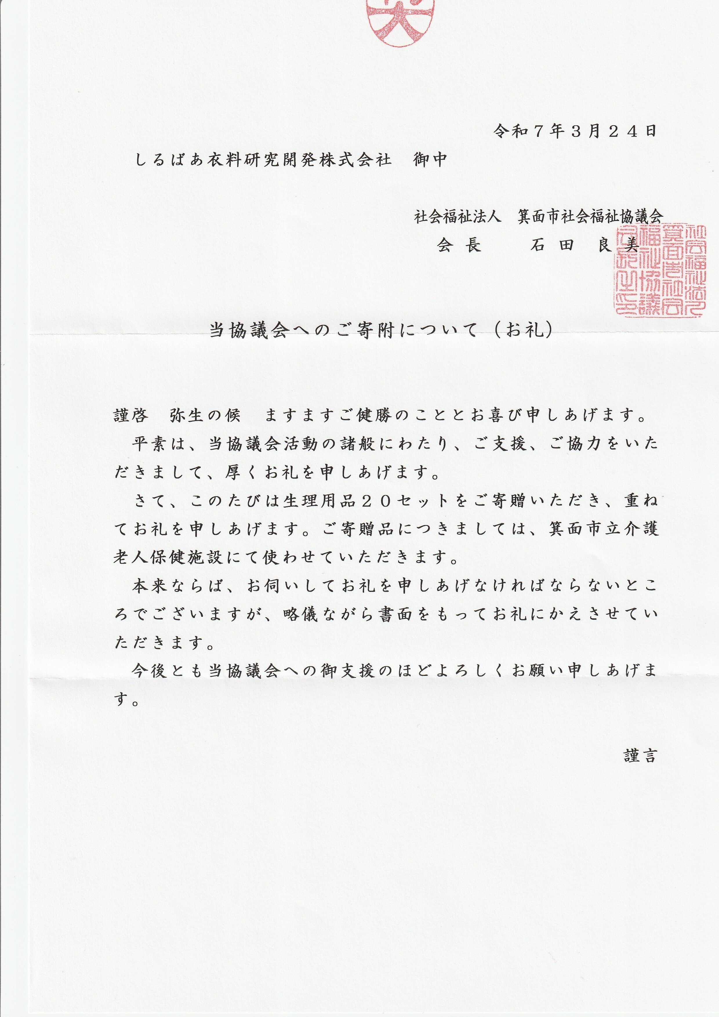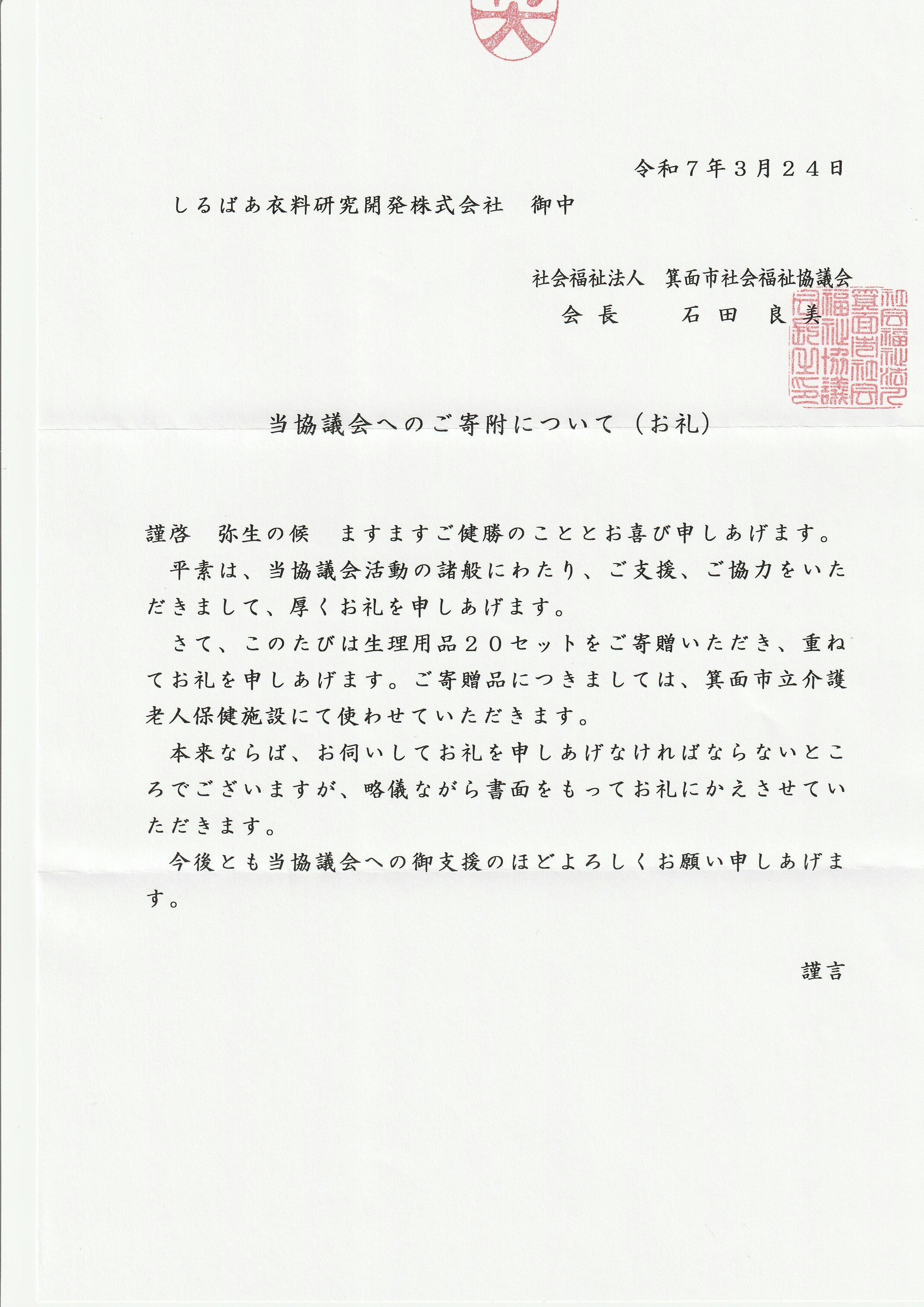 2025/04/01 17:03今回のプロジェクトにてご支援頂きました支援金を使わせて頂いて大阪府箕面市の「社会福祉協議会」さまに寄付させて頂いた布製生理用品に対してのお礼のお手紙を頂きました。当初予定していた、寄付先とは違う「老人介護施設」への寄贈とはなりましたが弊社の製品が、少しでもお困り方の元に届いて喜んで頂けたら良いと思っております。また準備が整いましたら引き続き支援プロジェクトを立ち上げさせて頂こうと思っておりますのでその際は、またご支援ご協力頂けましたら幸いです。ベイビーハーツ もっと見る