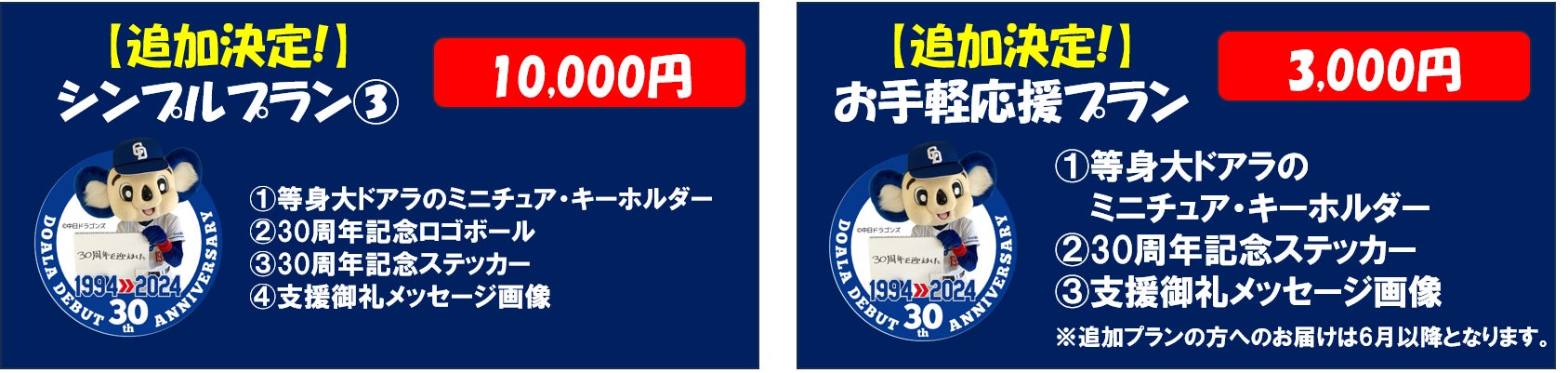 SNSやコメントにてご要望を多くいただいた、「30周年記念マグカップ」「30周年記念サーモステンレスボトル」を追加プランとして、明日2/23の19時より支援受付を開始します!夫婦で揃えたい、自分用はキープした上で友達のファンにプレゼントしたい・・・などのお声を頂戴しましたので、マグカップ、サーモボトルを、それぞれ個別で支援いただけるプランとしました。是非、この機会にお申込みください。・・・なお、3月上旬の開始目途で、追加のドアラさん盛り上げ企画も計画しています!引き続き当プロジェクトへのご注目、よろしくお願いいたします!