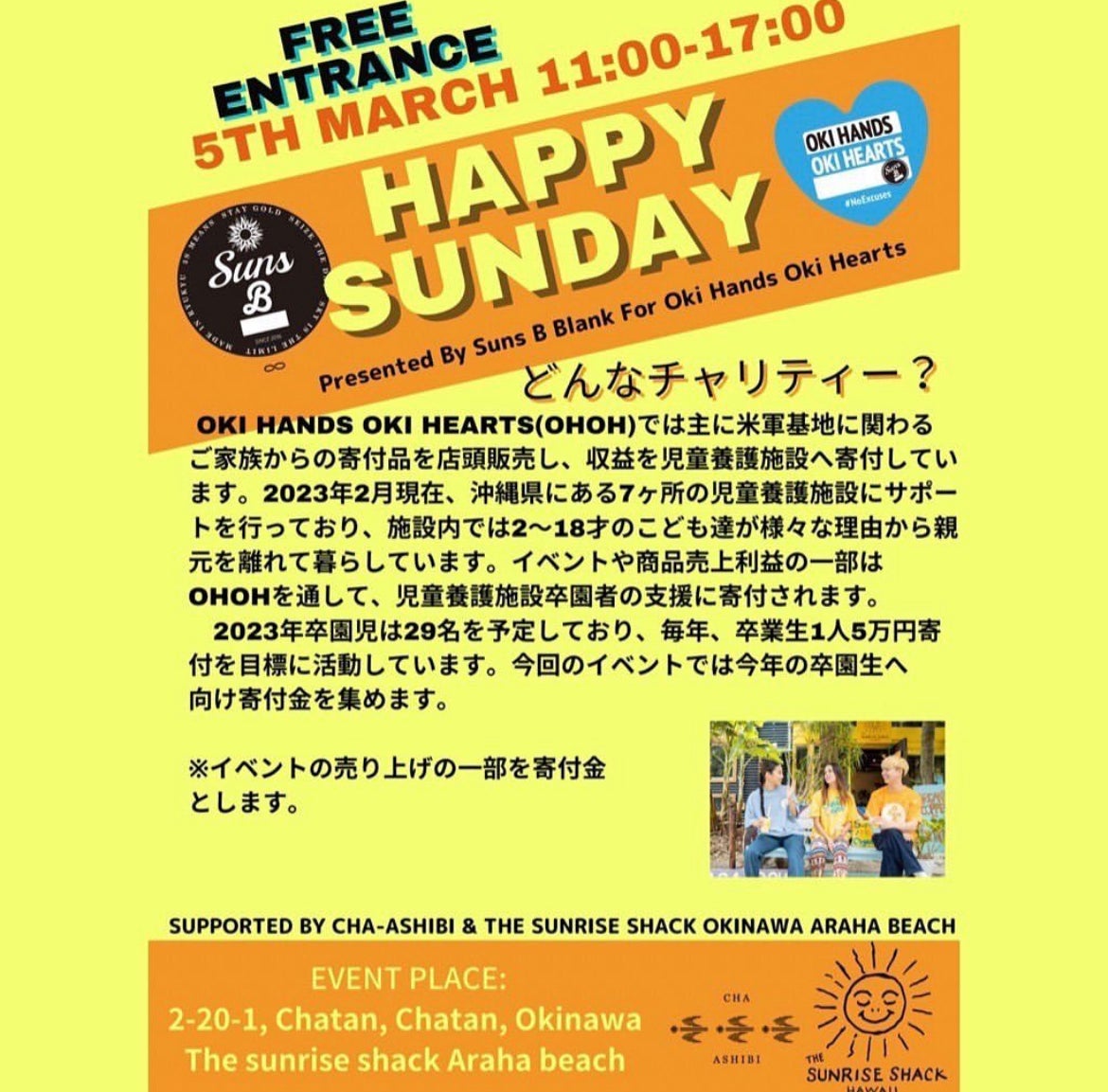 初めまして、私達は沖縄で児童養護施設を卒園する18歳を支援する活動を行っている琉球オリジナルブランドSuns B Blankです。普段は、アパレル展開を中心に活動を行なっていますが、困っている人の力になりたいという一心から、デザインの提供やボランティア活動も行っています。元々、児童養護施設への支援活動を行なっている一般社団法人Oki Hands Oki Hearts(OHOH)の活動に共感し、デザイン提供やTシャツ作成から協力を2020年から始め、今年2度目となるチャリティー音楽フェスティバルHAPPY SUNDAYを主催することにしました。