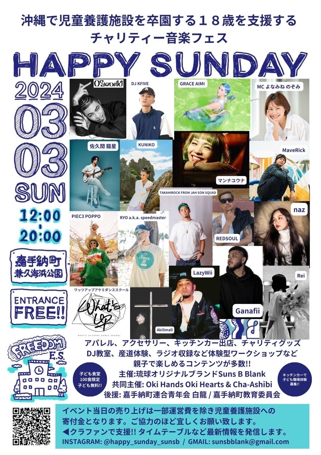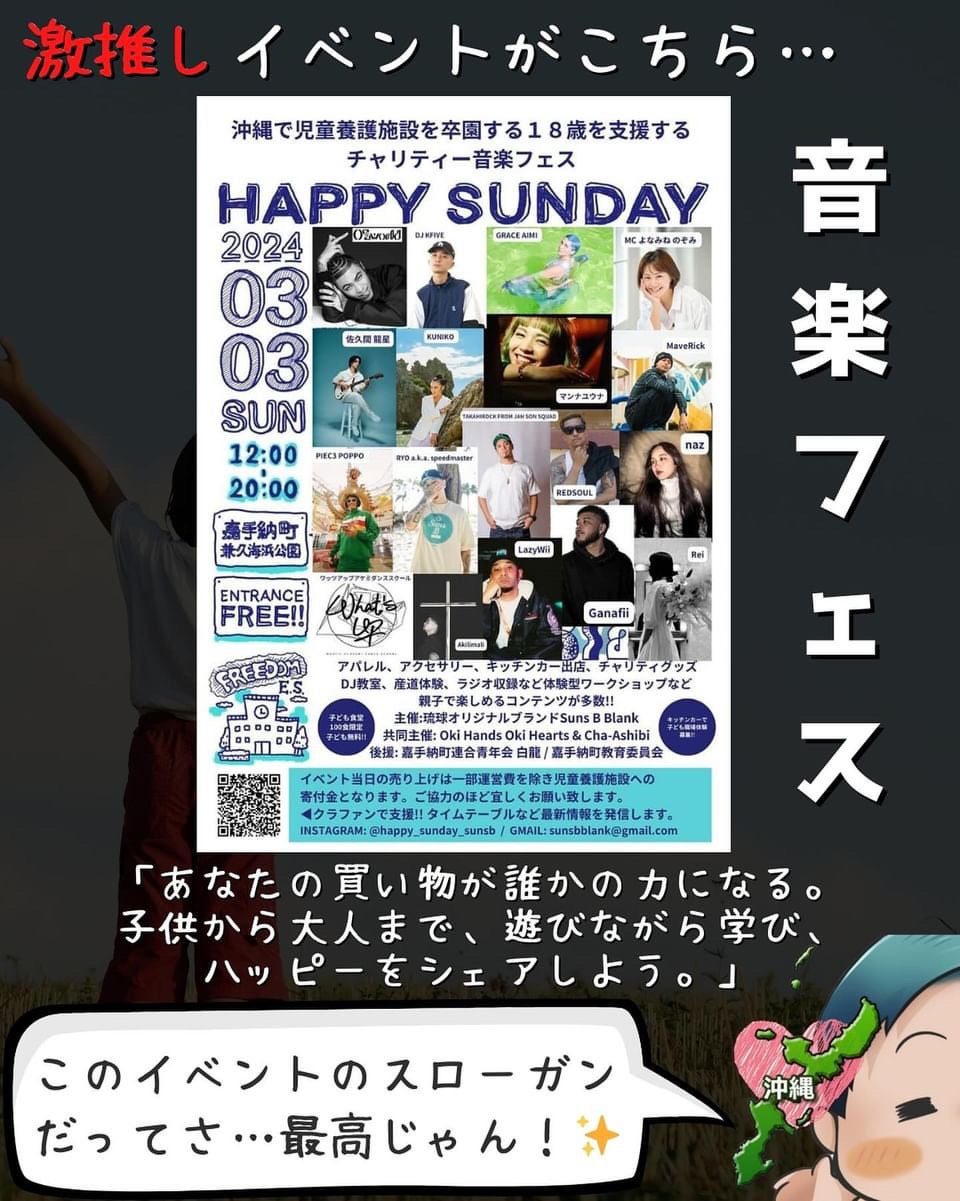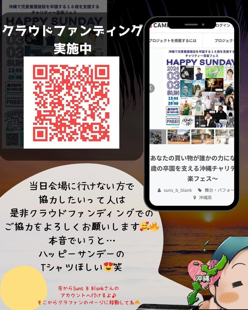 2024/12/04 17:00【HAPPY SUNDAY2025クラウドファンディング12月10日公開予定】公開前限定URL: https://camp-fire.jp/projects/803890/preview?token=2wh5xzoj↑フライヤー完成して追加しました。おかげさまでクラウドファンディング事前告知スタートから4日間で50名の登録がありました。ご協力ありがとうございます。あと5日、目指せ12/10までに残り50名でお気に入り100名登録です。ご家族や、兄弟、友達や職場の方々などに1〜2名ご登録頂ければ、X、Facebook、LINE、メールアドレスなどから登録できますとお伝えください。引き続き宜しくお願い致します。【HAPPY SUNDAY 2025】児童養護施設卒園児を支える~沖縄チャリティー音楽フェス~開催日 2025年2月23日(日) 12:00-20:00開催場所 沖縄県嘉手納町兼久海浜公園入場無料※荒天中止主催: Suns B Blank後援:嘉手納町 / 嘉手納町教育委員会音楽、アパレル、キッチンカー、DJ教室のような体験型ワークショップなど親子でイベントを楽しめます。本イベントの売り上げから沖縄県内の児童養護施設を退園する児童へ寄付金を贈呈します。クラウドファンディングにも挑戦中です。事前のお気に入り「いいね!」登録が多いほどプロジェクトが成功しやすいと言われています。是非、皆様のご協力よろしくお願い致します。﹏﹏﹏﹏﹏﹏﹏﹏﹏﹏﹏﹏﹏﹏﹏﹏﹏﹏【後援】嘉手納町 / 嘉手納町教育委員会【Special Thanks】・株式会社ラクセスイノベーション・株式会社グローバルアイランド・株式会社Islandgate・アイトラ株式会社・有限会社オフィス赤嶺・うみとたいよう・イシガントゥ株式会社・株式会社D2T・合同会社レック・エスリンク株式会社・株式会社Green沖縄・社労士オフィスHana・ディクシア合同会社・株式会社シーサー不動産・有限会社ISA もっと見る【HAPPY SUNDAY2025クラウドファンディング12月10日公開予定】スタートまでに[いいね]ボタン100件を目指しています。登録のご協力宜しくお願い致します。