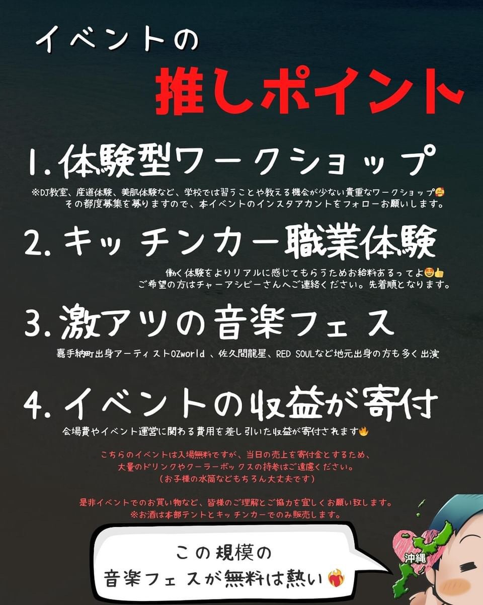 私たちが仲の良く、2020年から共に児童養護施設をサポートする活動に協力してくれているアーティストの皆様や、北谷町を中心に子供の居場所作りを行なっているCha-Ashibiの皆さんと共に、沖縄の子供達や、その孫まで、子供たちの未来を明るく愛のあふれる素敵な世の中にしたいという思いから、このチャリティーイベントを開催します。