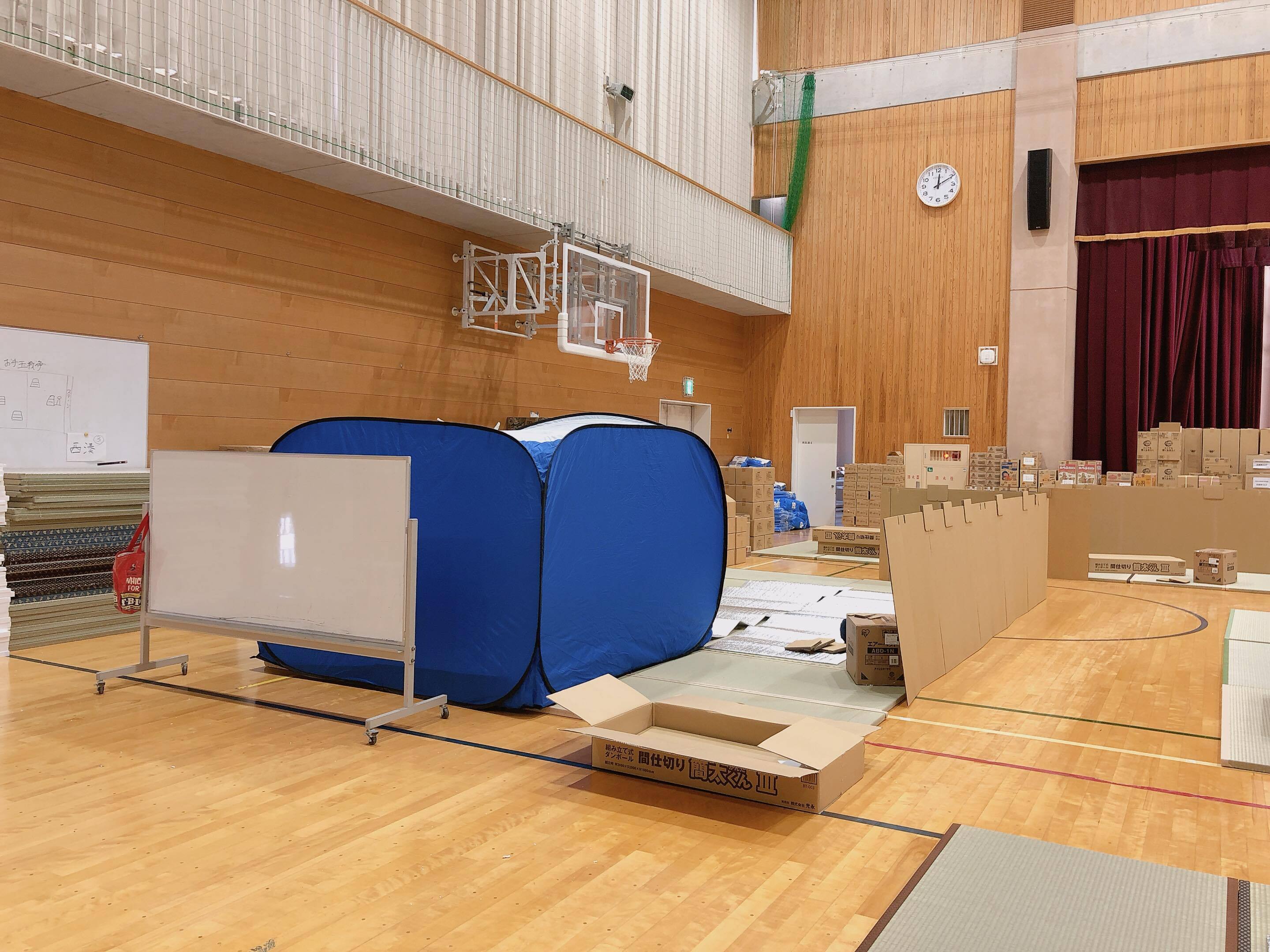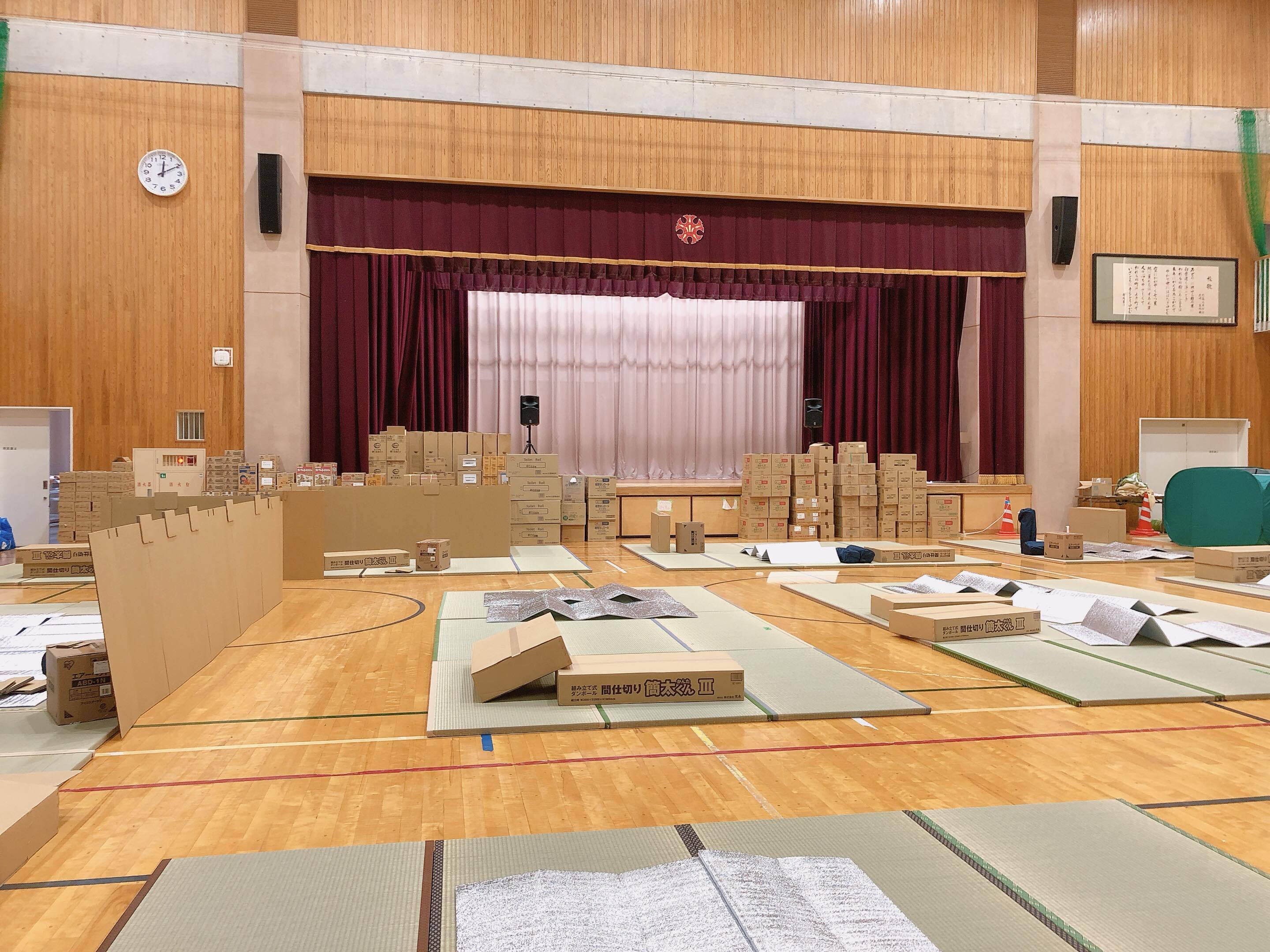 1/27〜28に、小丸山小学校の避難所では、教室から体育館への引っ越しが行われました。体育館に8畳間や10畳間などの区画をつくり、ダンボール衝立やワンタッチテント、エアベッド、ダンボールベッドなどを使って、スペースを作っていきました。