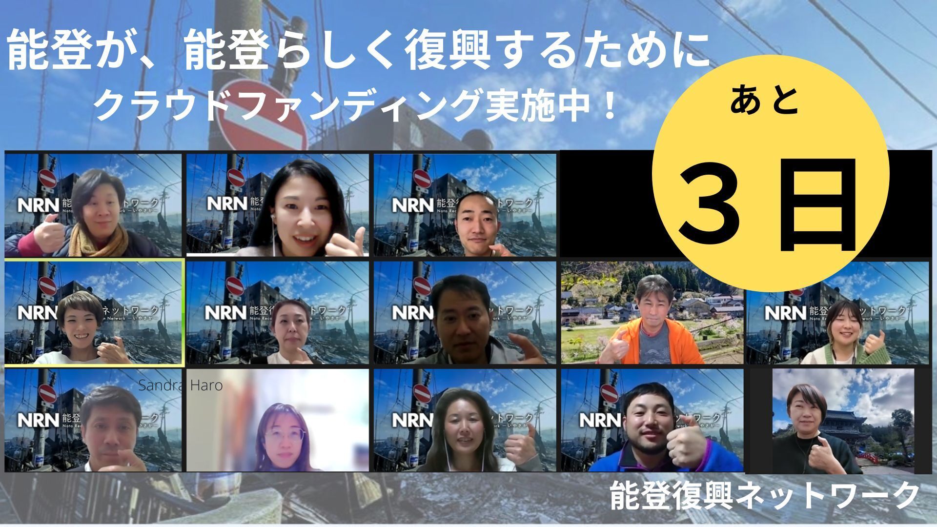 これから能登で始まる多くの復興プロジェクトを作っていきます。そのプロジェクトの一つ一つが花を咲かせるには、まだまだ時間がかかると思います。けれど、より多くの人たちに能登のこれからの歩みを見届けて欲しい誰もみたことのない未来に向かっての一歩をより多くの人たちと踏み出すためにも、あなたのお知り合いにあと一人だけ、この輪に加わってくださるようにお呼びかけしてくれませんか?