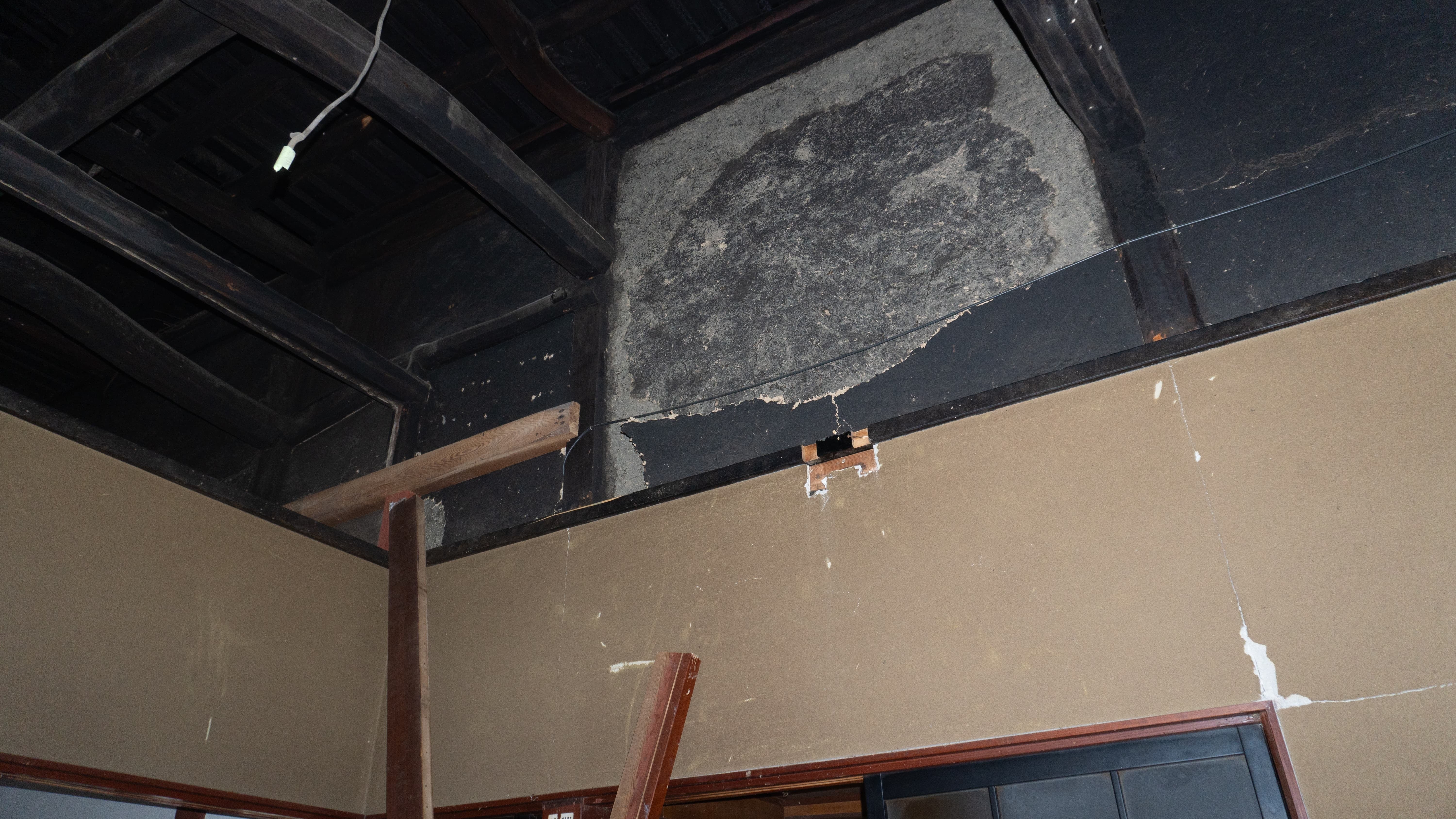 柱が歪み、壁が割れている様子