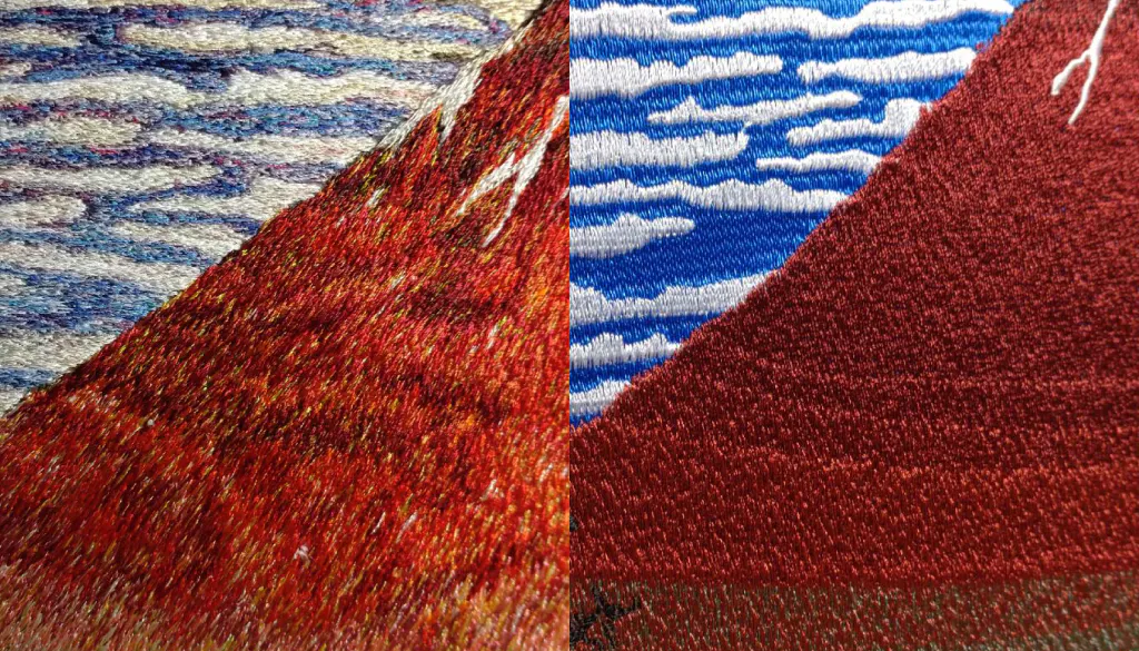 左が横振り刺繍による富士山の表現。右が機械刺繍。色彩の幅と繊細さが一目で分かります。