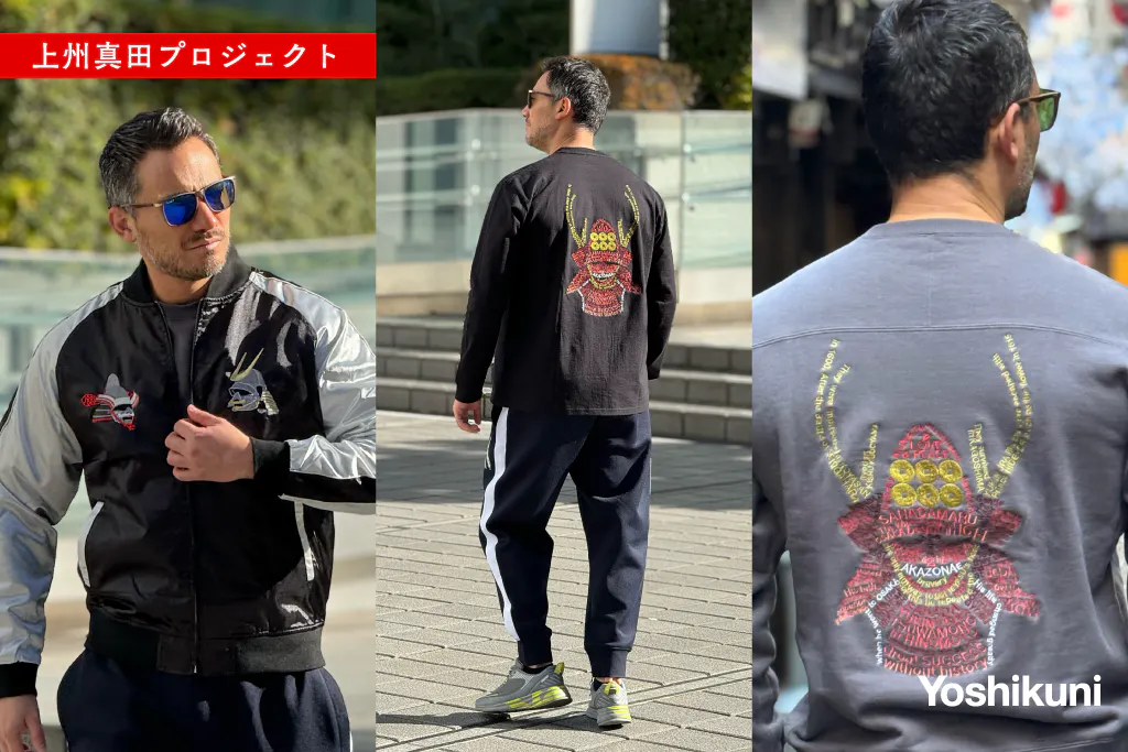 私たちの新しいスカジャンコレクションは、群馬の伝統技術・横振り刺繍と真田幸村の象徴である赤備え甲冑を融合し、真田家を彩った人物が一針一針に込められました。