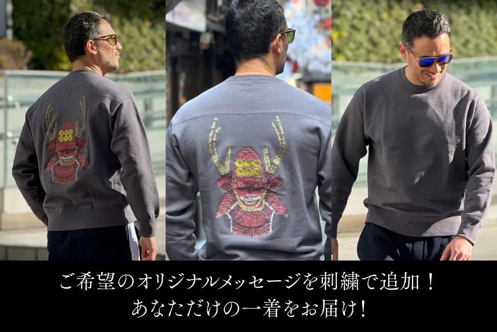 真田幸村スウェットは、既存の刺繍のグラフィックに加えて、購入者のオリジナルメッセージ(英語、日本語で可能)を追加で刺繍(機械式)いたします。