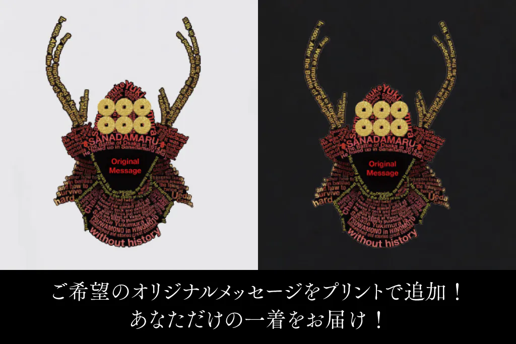 真田幸村長袖Tシャツは、既存の刺繍のグラフィックに加えて、購入者のオリジナルメッセージ(英語、日本語で可能)を追加で刺繍(機械式)いたします。