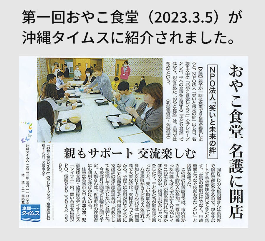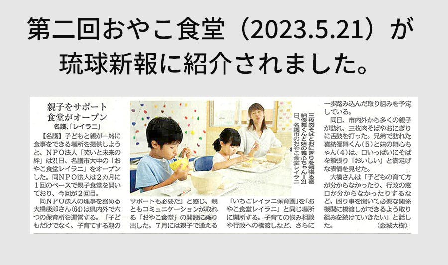 特に、いわゆる「子ども食堂」ではなく、親も一緒に参加ができる「おやこ食堂」を行政と連携して継続的に開催している例は、全国でも恐らく私たち初めての試みであり、県内メディ アや行政の広報が取り上げてくれたこともあり、沖縄県内での認知度も拡大していっている最中でした。