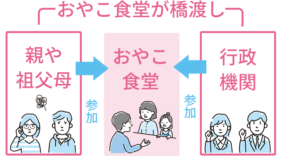 そのため、おやこ食堂への参加をきっかけに、暮らしに関わるさまざまな悩みをお持ちの親や、おじいちゃん・おばあちゃんを、行政機関へと橋渡しする役割も果たしています。
