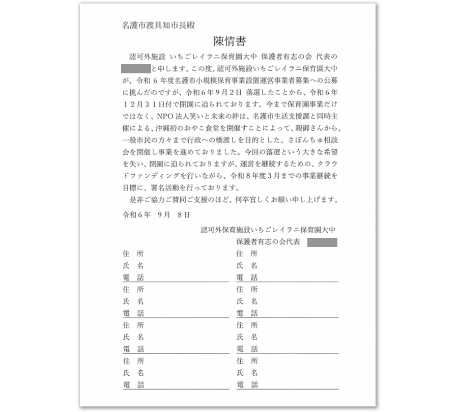 私たちは沖縄のほか、埼玉県内でも保育園を運営しております。 そのため、残念ながら本プロジェクトが目標未達で終わってしまった場合には、運営参加や実地研修などのリターンは、埼玉県内会場にて提供になる場合があります。
