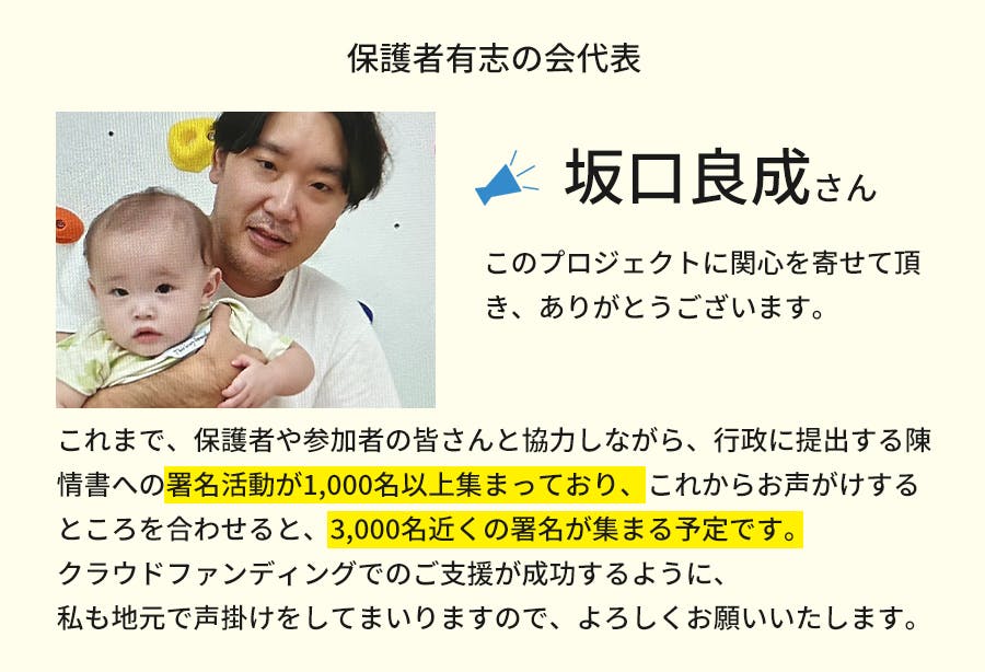 2024/12/29 07:00皆様、今年は大変お世話になりました。今日は、年内最後の投稿として、今年おやこ食堂/おやこ保育園に参加してくれた人たちの、素敵な笑顔をご紹介したいと思います。保育園の続けて来た中で、子どもさん達の抱える様々な問題は、実は親御さんも悩んでおられ、親子揃って安心して参加でき、気軽に相談できる場所を作る必要があると思い、おやこ食堂を始めました。手探りの中で、少しづつ共感した人たちが集まってくれ、行政とも連携して今まで続けてくることができ、本当に感謝しております。おかげで、多くの子どもさんと親御さんの笑顔に触れ、幸せな気持ちに包まれていました!今回のクラファンは、工事不備による閉園危機の回復が目的ですが、実はもう2つ目的があります。その1つ目は、私たちに沢山の笑顔をくれた親子の皆さんへの感謝、2つ目は、少しづつ広がり始めて来た共感の輪を広げ、同じ様な取組みを全国に広げることです。特に2つ目の目的は、最近、全国の保育園やNPOから問合せや見学の連絡をいただいたり、取材に来てくれたり、といったことが増えて来ていて、広がり始めていることを感じていました。いま、おやこ食堂/おやこ保育園は、非常に難しい局面を迎えており、その局面を乗り越えるためにはクラファンの成功は不可欠です。このようなお願いは恐縮ですが、どうかご支援・ご協力いただきますよう、よろしくお願いいたします。その代わりと申しては失礼ですが、充実したリターンのラインナップをご用意しておりますので、この機会にぜひお求めいただければ幸いです。それでは、皆様良いお年をお迎えくださいませ。 もっと見る
