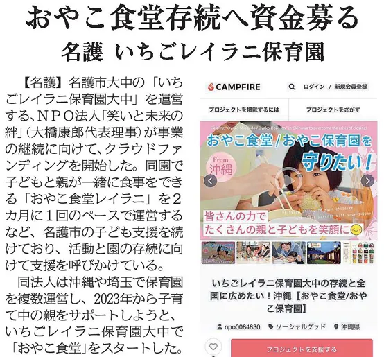 2025/01/01 06:00謹んで新春をお祝い申し上げます。旧年中は大変お世話になり、誠にありがとうございました。今年のお正月はご家族皆様で、にぎやかに、楽しくお過ごしのことと存じます。今年は、懸案の建築不備を解消するため、まずはクラファンを成功さえ、おやこ食堂/おやこ保育園を続け、皆さんが笑顔で過ごせる場を提供して行きたいと思っております。私たちも精一杯頑張って参りますので、皆様も引き続きお力添えのほど、よろしくお願いいたします。なお、昨年末のことですが、2024/12/23付けで、琉球新報さまが私たちのクラファンを取り上げて下さいました。大変ありがたいお話しであり、大きな追い風になってくれることを願っております。本年も皆様が御健勝で御多幸でありますよう、心からお祈り申し上げます。2025年 元旦【琉球新報さまサイト】https://ryukyushimpo.jp/tag/%E3%82%AF%E3%83%A9%E3%82%A6%E3%83%89%E3%83%95%E3%82%A1%E3%83%B3%E3%83%87%E3%82%A3%E3%83%B3%E3%82%B0【応援いただきたいこと】ご家族、ご友人、お知り合いなどにぜひ、下記の依頼をお願いいたします。①リターン購入によるご支援②ご家族、ご友人、お知り合いへのご紹介③SNSでのシェア④応援コメントの投稿⑤応援の声の掲載※下記からチラシをダウンロードできます。また、ご希望の方には印刷物もお渡しいたします。https://camp-fire.jp/projects/736166/view/activities/653153#main もっと見る【紹介】おやこ保育園に来てくれている人たちをご紹介します