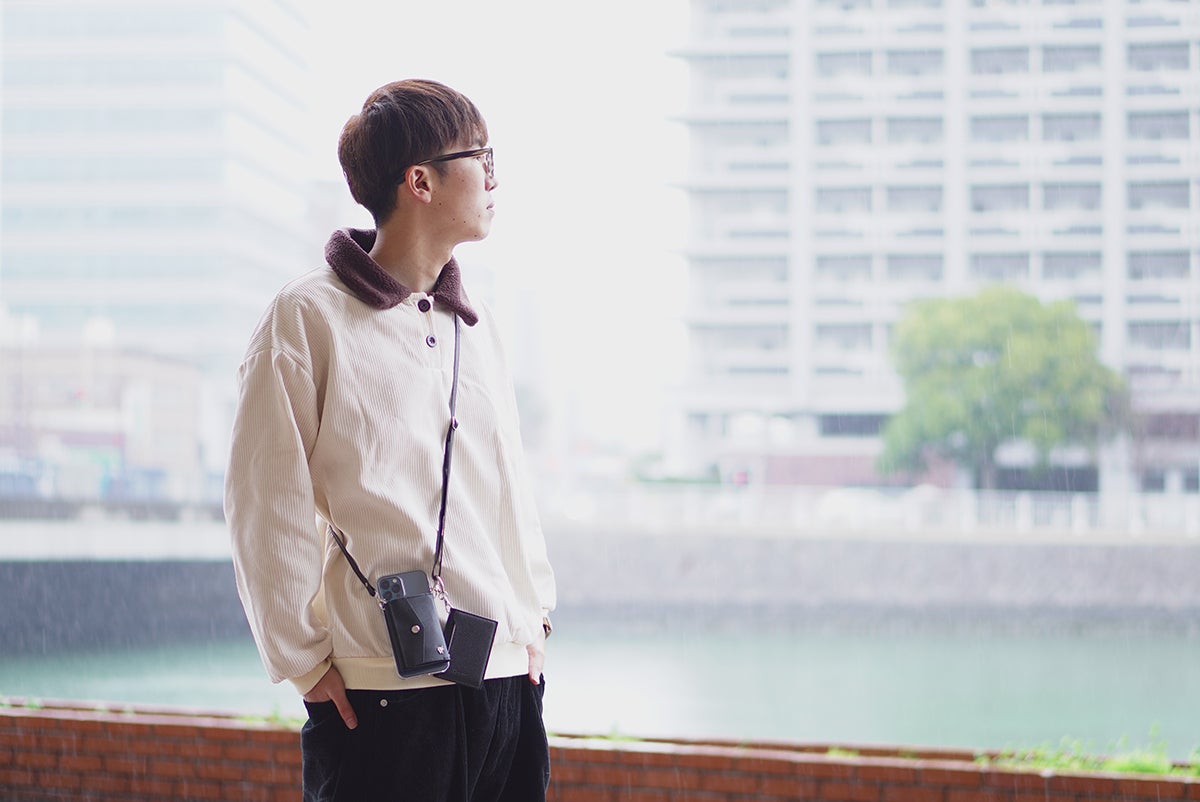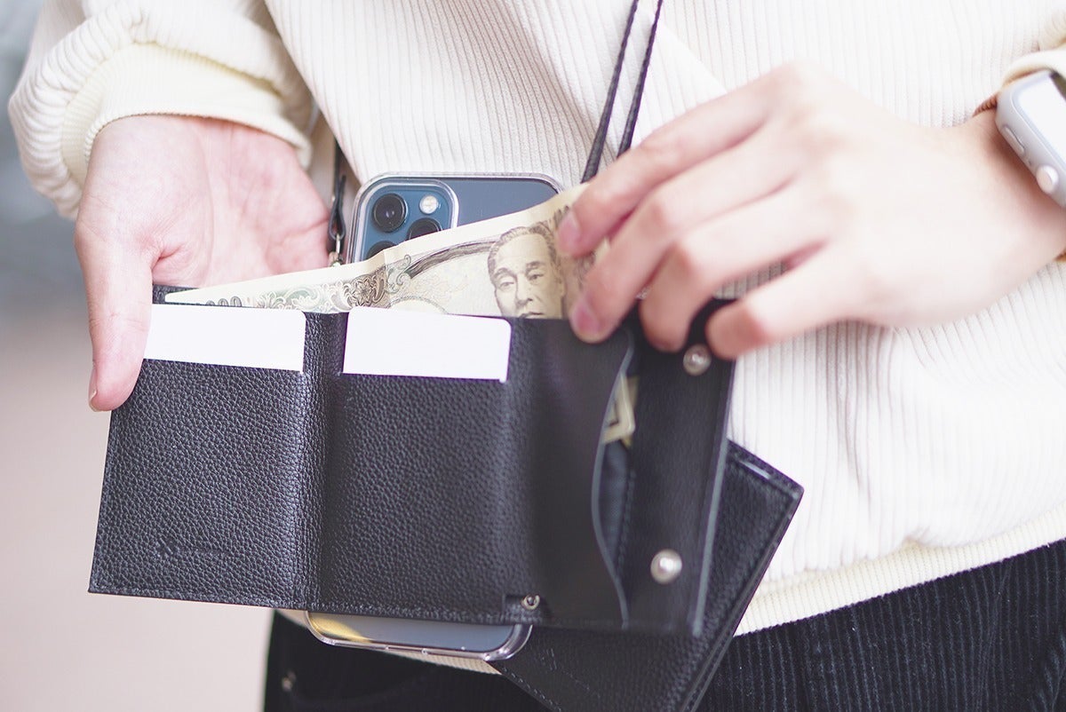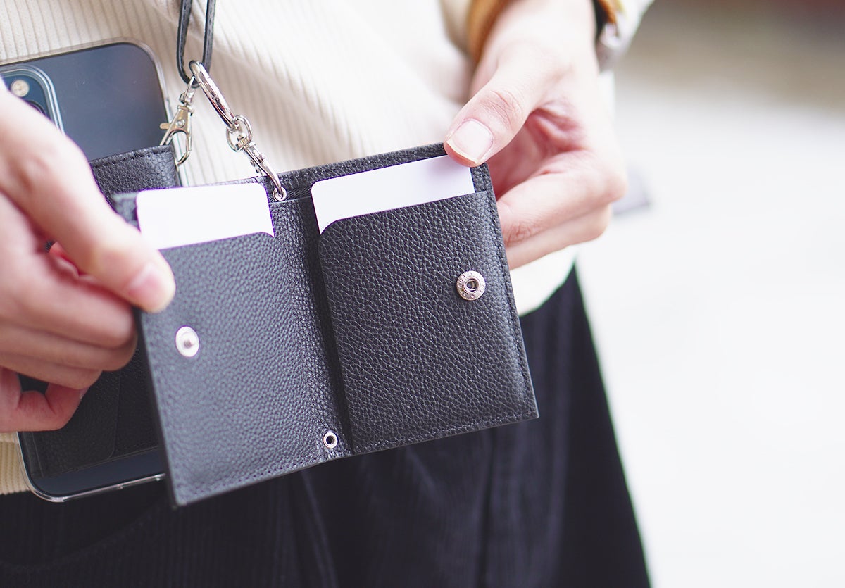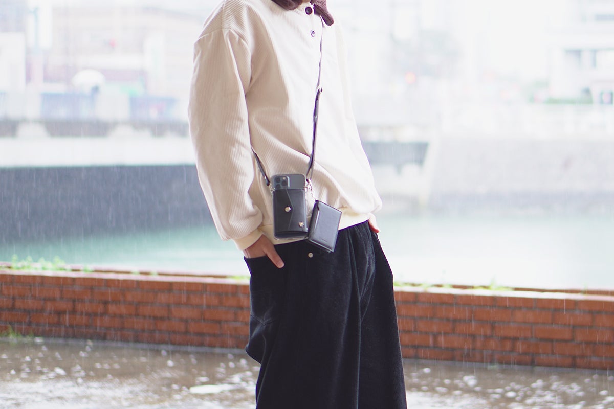 スマホショルダー財布として使えて、これだけで手ぶらで外出ができる。