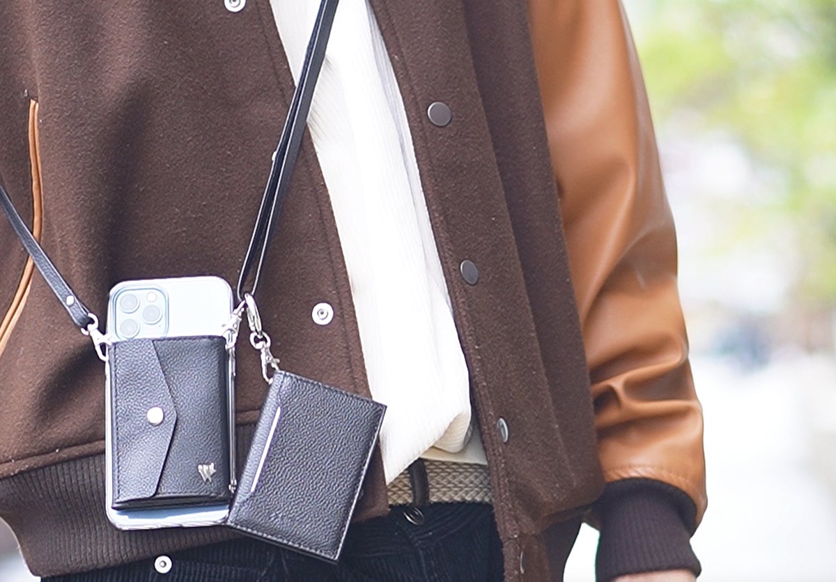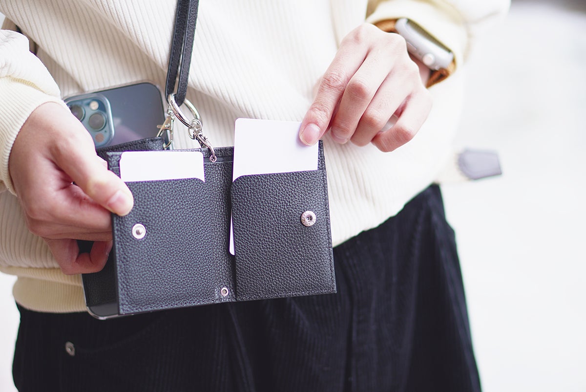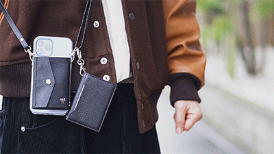 スマホと財布「and W」をドッキングすることで、スマホショルダー財布として使える。スマホと財布の着脱は自由自在。財布「and W」には、カード4枚・紙幣8枚・コイン15枚・鍵1つ収納できる。