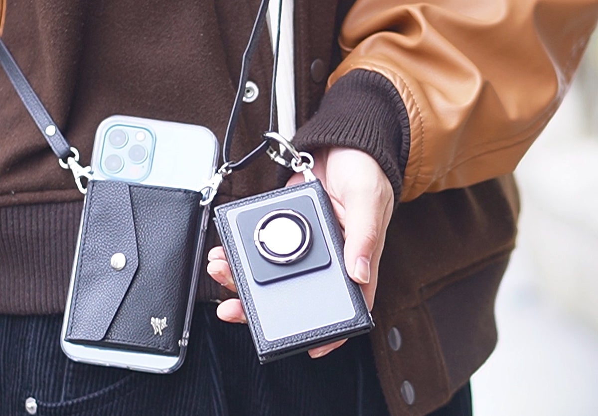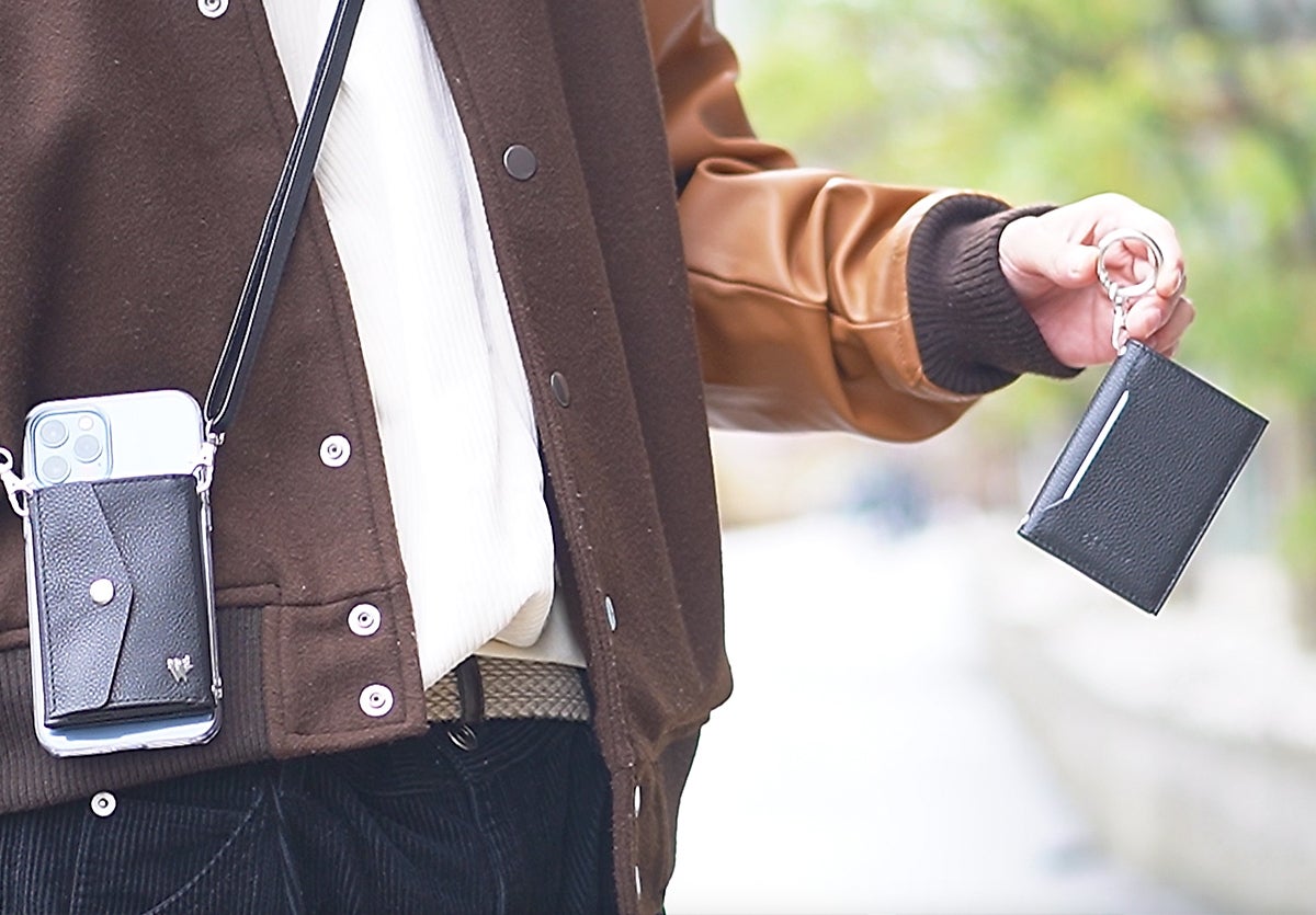 この度、弊社のオリジナル商品の「and W」+cardというショルダースマホ財布を作りました。この製品は、以前リリースした「and W」separateという製品を、お客様の声を反映し改良を加えた製品となります。財布をスマートフォンへドッキングした際に、どうしてもカードケースを余らせてしまうというご意見を元に、カードケースにキーリングを付属し、ショルダースマホ財布としてお使いであっても、カードケースをさらに後付できるよう工夫いたしました。また、ジョイントパーツを用いることで、併用可能なスマホリングも、常に携帯しやすいようにしております。