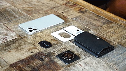 財布・カードケースの「マウント」と互換性のあるスマホリングもご用意。帰宅したら財布を外して、スマホリングで持ちやすく、 スタンド利用で動画も視聴しやすく
