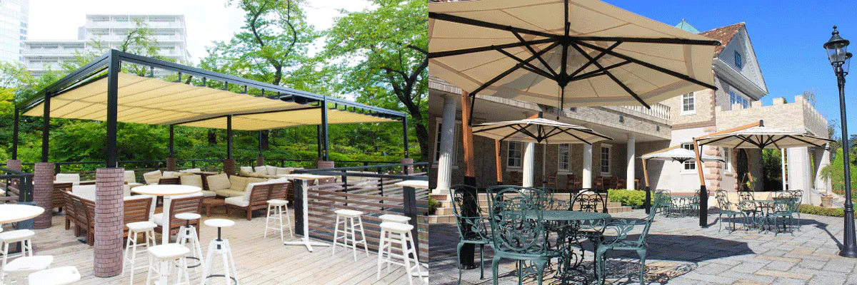 主には、パラソルやオーニング(日除け・雨除け)を自社工場で製造し、リゾート施設、アミューズメントパーク、学校、幼保施設、公園、カフェ、レストランといった様々な屋外スペースへ導入いただいております。