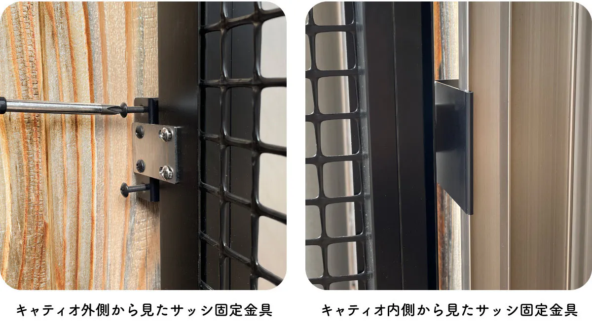 また、揺れ止めとして窓サッシ枠へ「サッシ固定金具」での固定が必要になります。