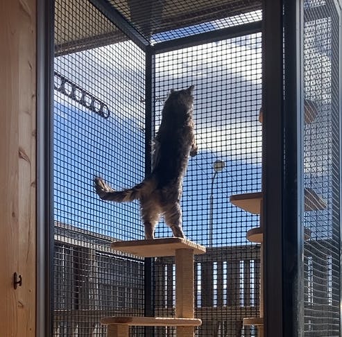 初めてのキャティオに戸惑いを感じつつ興味津々のネコの「あんこちゃん」