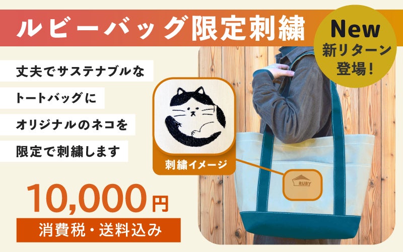 このクラウドファンディング限定でネコの刺繍を施したオリジナルのルビーバッグをご用意しました。