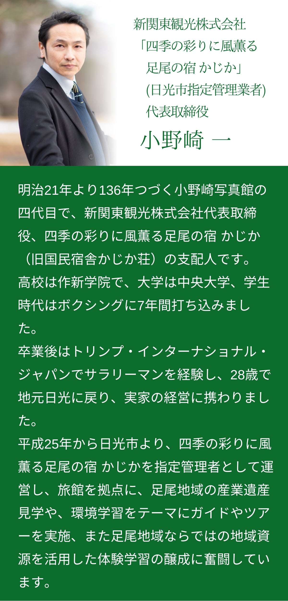 はじめまして!新関東観光株式会社「四季の彩りに風薫る足尾の宿 かじか」の小野崎と申します。数あるプロジェクトの中からご覧いただき、本当にありがとうございます。