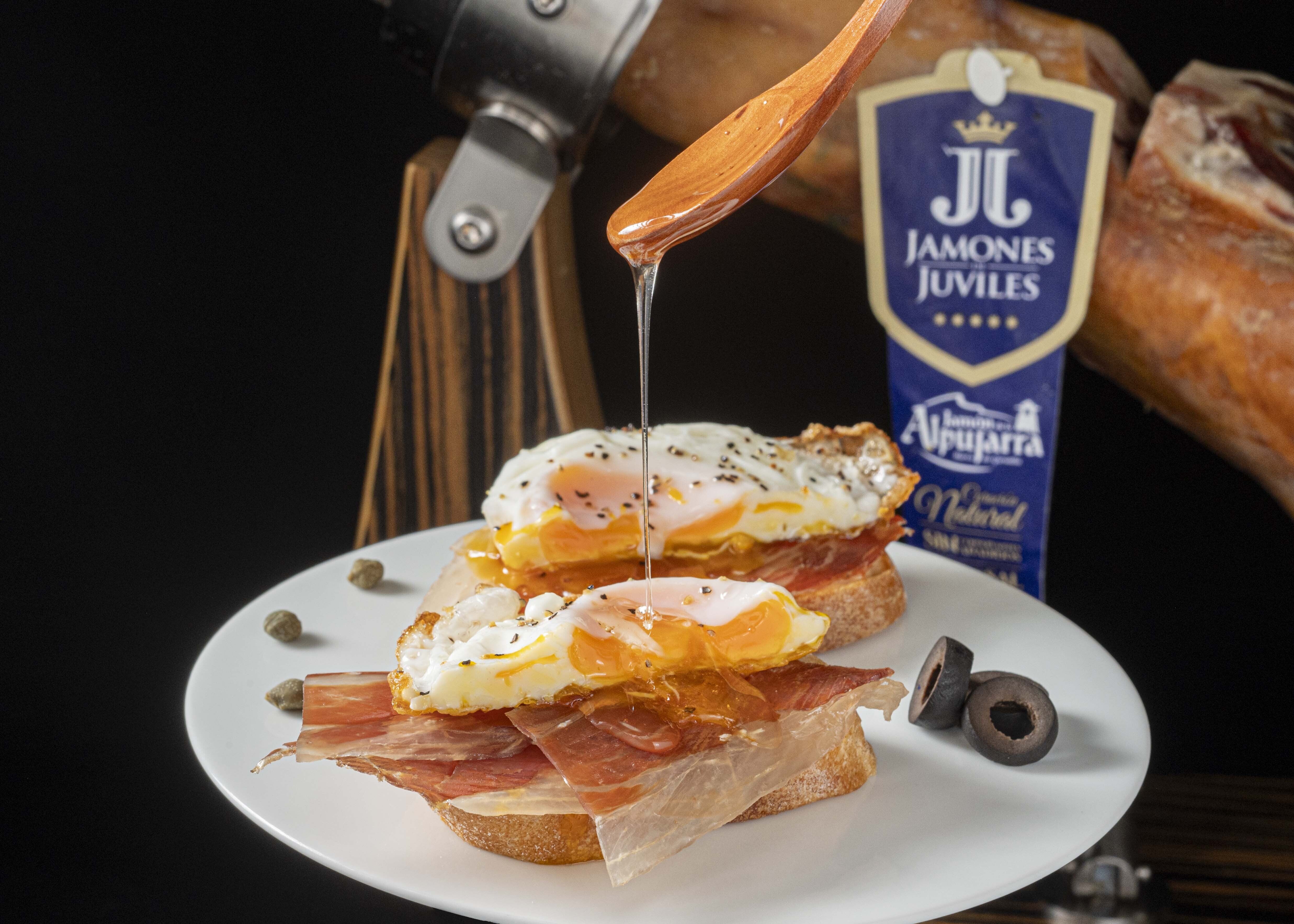 写真は、バケットにのせたスペイン産の生ハムに、半熟目玉焼きをに載せて、足尾産ハチミツをかけて食べるととても美味しいです。