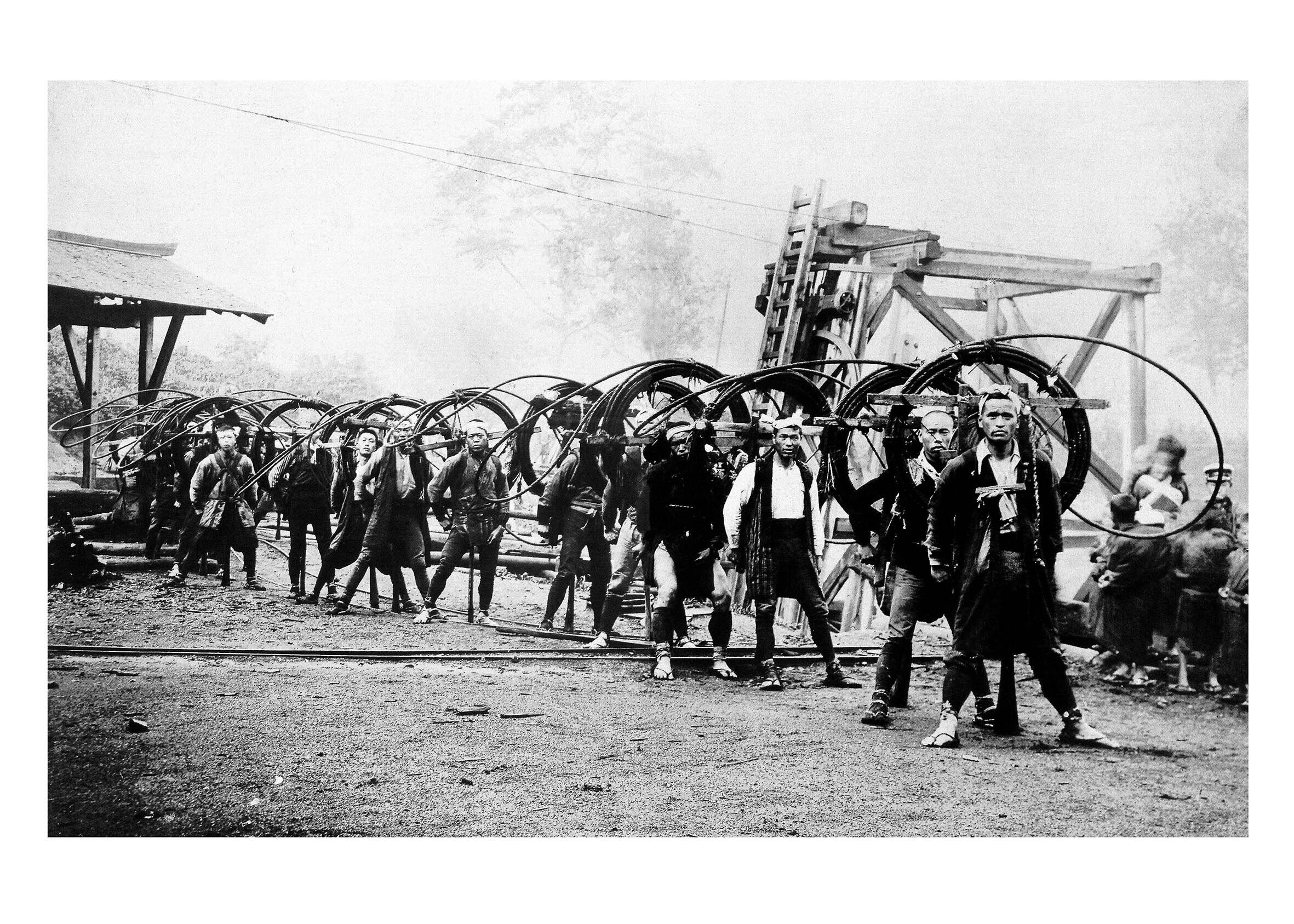 上の写真は「架空索道」のロープ運搬。索道に使われる重いロープは、この様に人が背負って運びました。(明治末期撮影 撮影者:小野崎一徳)