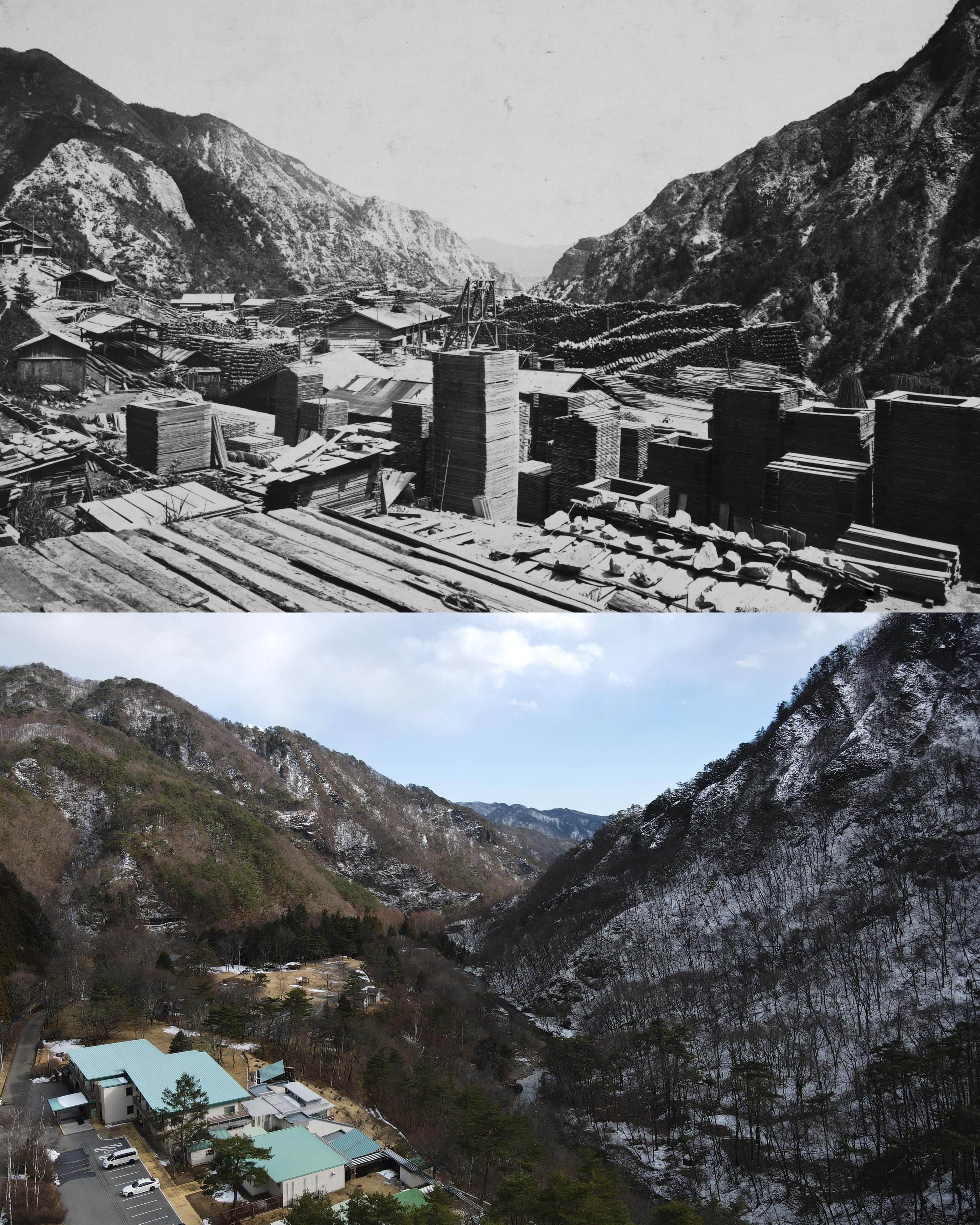 写真下は現在で左下に四季の「彩りに風薫る足尾の宿 かじか(旧:国民宿舎かじか荘)が写っている)