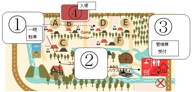 [①一時駐車後 ---- > ②徒歩にて受付 ---- > ③受付後に車へ徒歩で戻り ----- > ④各コテージ・テントサイトへ車入場]