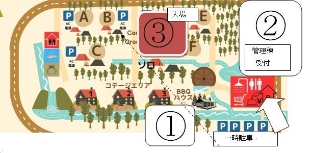 [①一時駐車 ---- > ②管理棟にて受付 ---- >③車にて各コテージ・サイトへ直接入場]