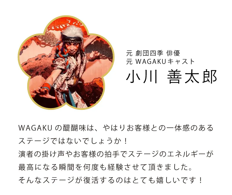 WAGAKUとは、「和」を「楽」しむという意味。親しみやすい現代演劇に、「和」のデザインや音を取り入れたスタイルで、歌や舞などのナンバーをお楽しみいただけます。