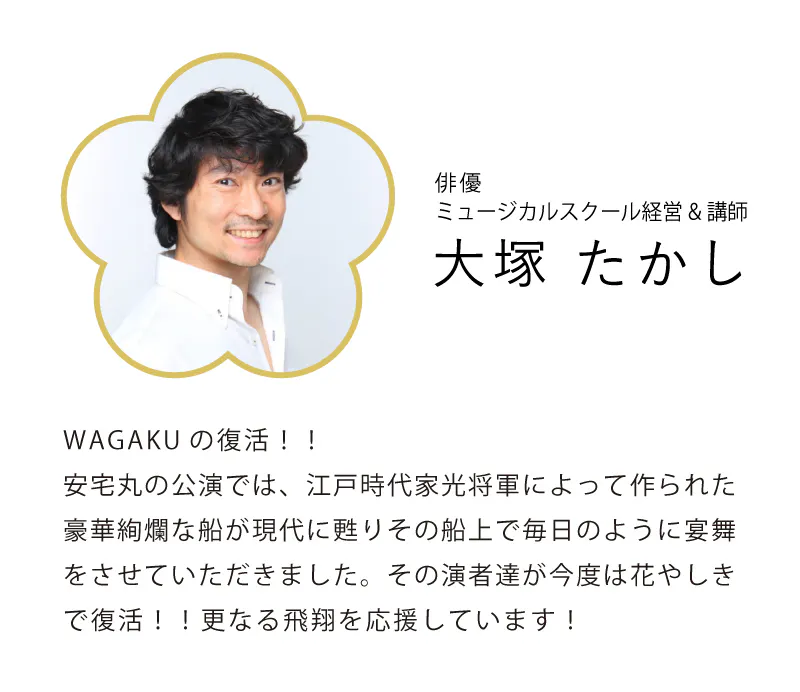 2014年、東京湾クルーズの和船「安宅丸(あたけまる)」との出会いから、表現したかった演劇の形をようやく実現でき、世界中からお客様が訪れるロングラン公演へと成長しました。