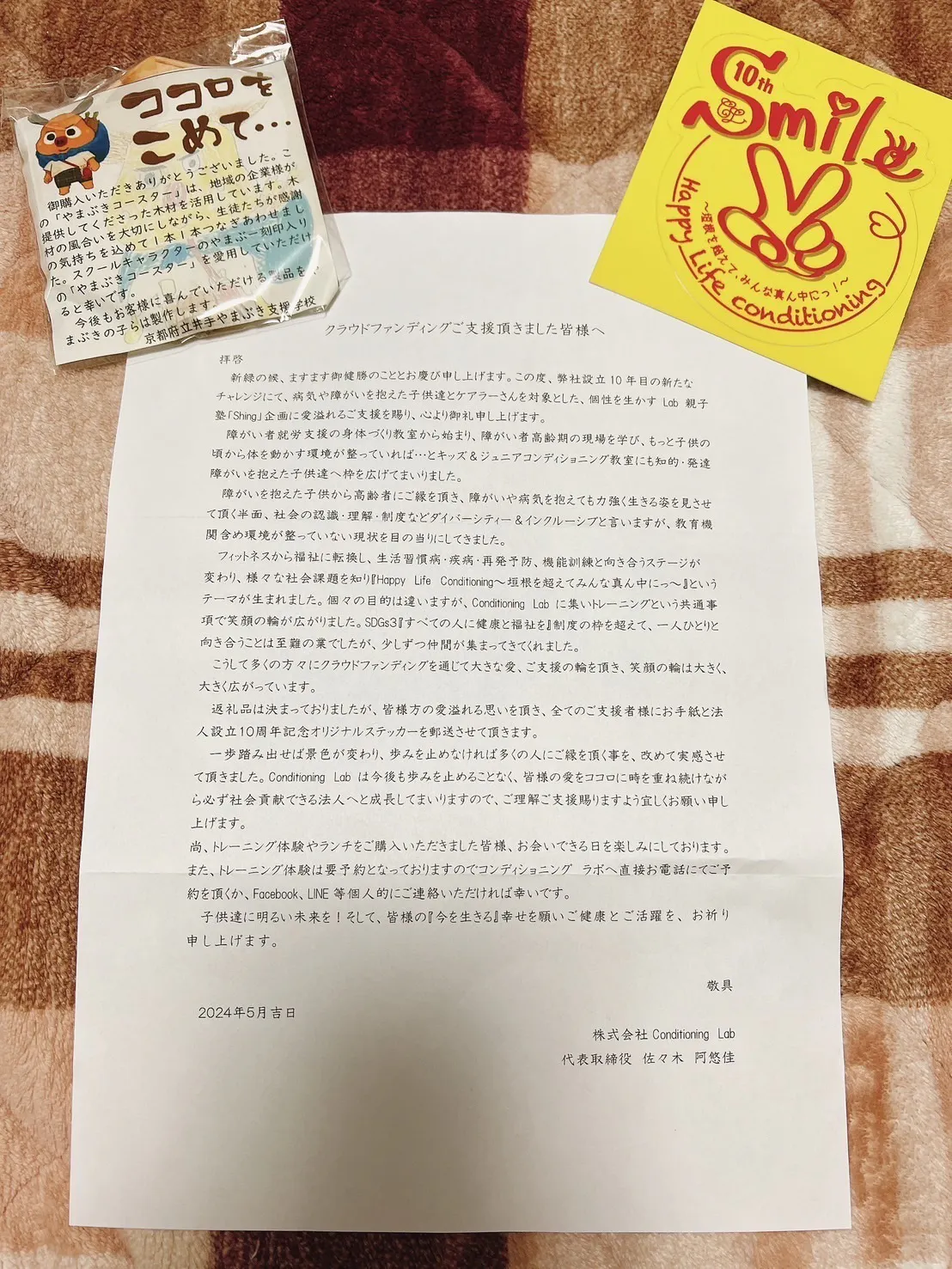 複数名の方々から「届いたよ〜!」とご連絡を頂き、又一つ「愛」を頂いております。今回ご寄付という支援の方のみとなりましたが、京都府立井出やまぶき支援学校高等部の生徒さん達にお願いし、一つひとつ手作りの木製コースターを送らせて頂きました。