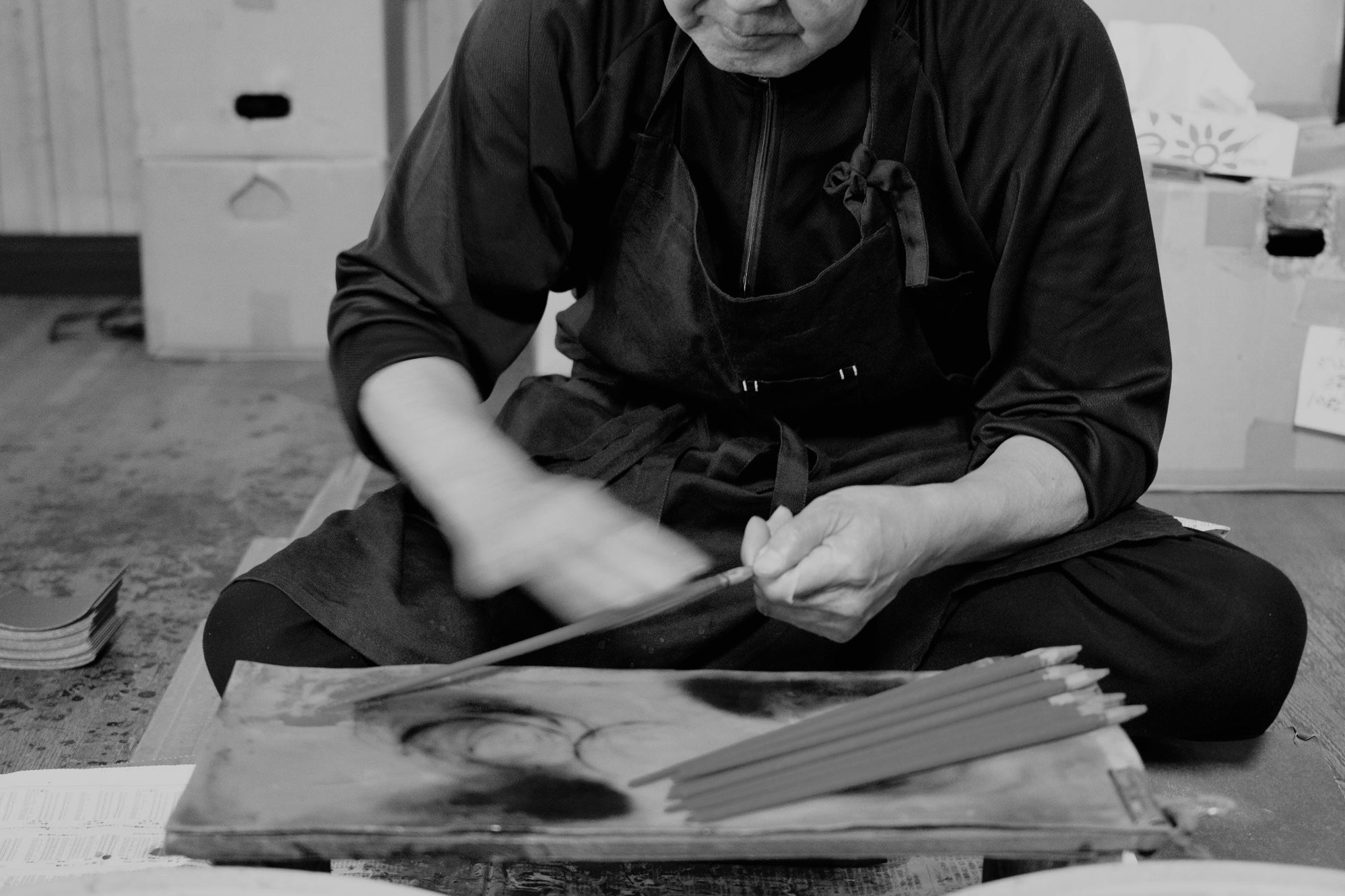 輪島うるし箸はヒバの天然木を素地にいくつもの工程、いくつもの職人の手により仕上げられております。塗って、乾かし、研ぎを繰り返して時間をかけてやっと箸ができます。