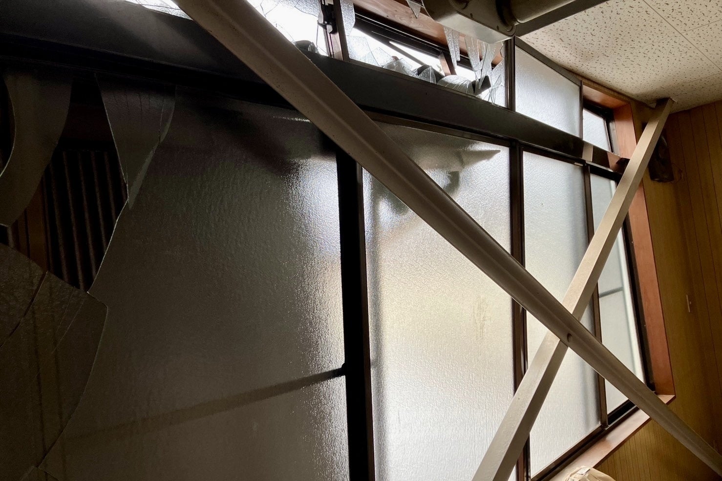 窓のサッシ部分が寄りかかる倒壊瓦礫にギリギリで耐えています。