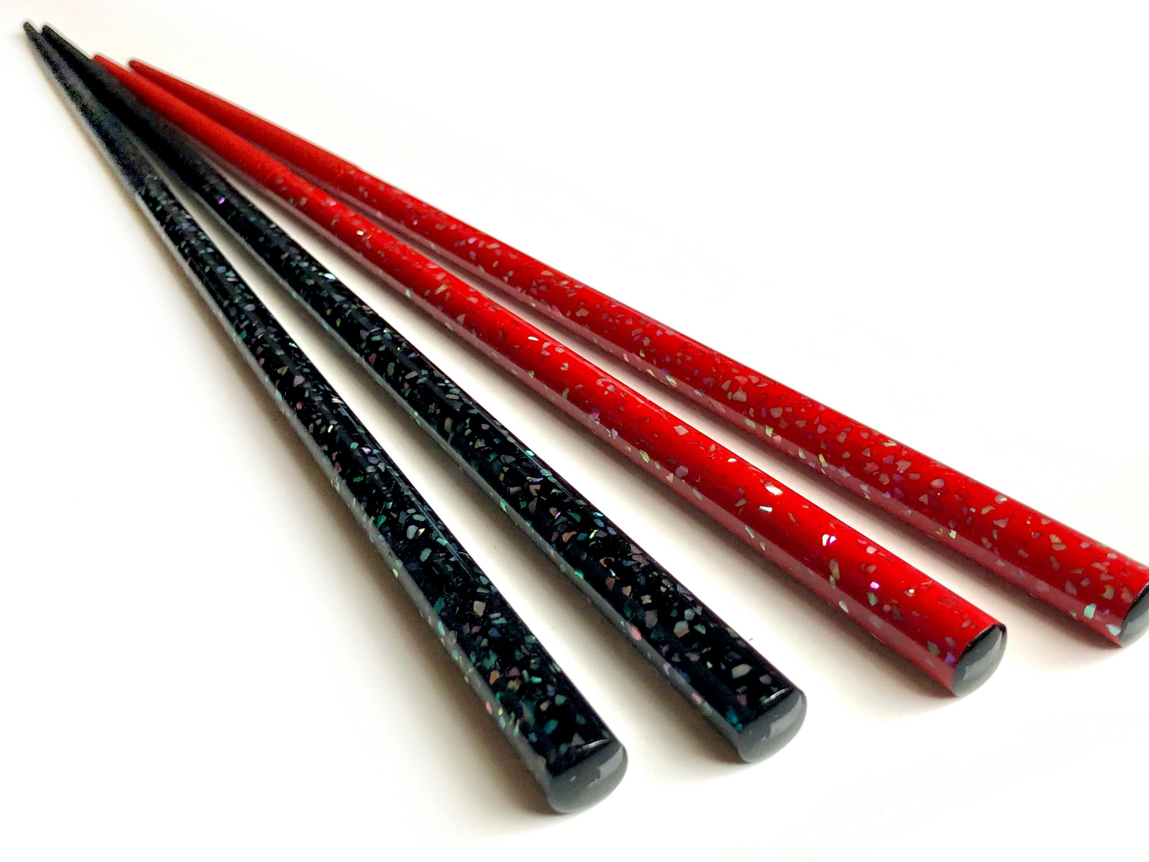 輪島塗の里、石川県輪島市にある岩多箸店の職人が1年以上もの歳月をかけて作るハイクオリティな箸。漆を塗り重ねた箸に漆で青貝を付け、その上から更に漆を塗り重ねます。完全手作業で塗って乾かしを何度も繰り返し貝を研ぎ出し、艶を上げて仕上げます。