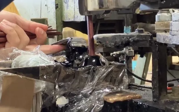 箸を逆さまにして、下から塗料をチョンチョンと付けます。今は人間の手でセットし、人間が下からチョンチョン…笑(動画は岩多箸店公式Xにて!)