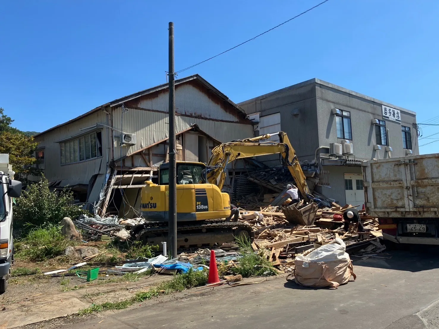 解体前にコーディネーターさんから隣接部分の工事は約1日半かかるので2日みておいてくださいと話がありました。いざ解体を始めて見ると中の荷物や災害ごみも多く、作戦を変更したり、ゴミ置き場との距離、そして当然岩多箸店への配慮もしつつ・・・思ったよりなかなか進まず。