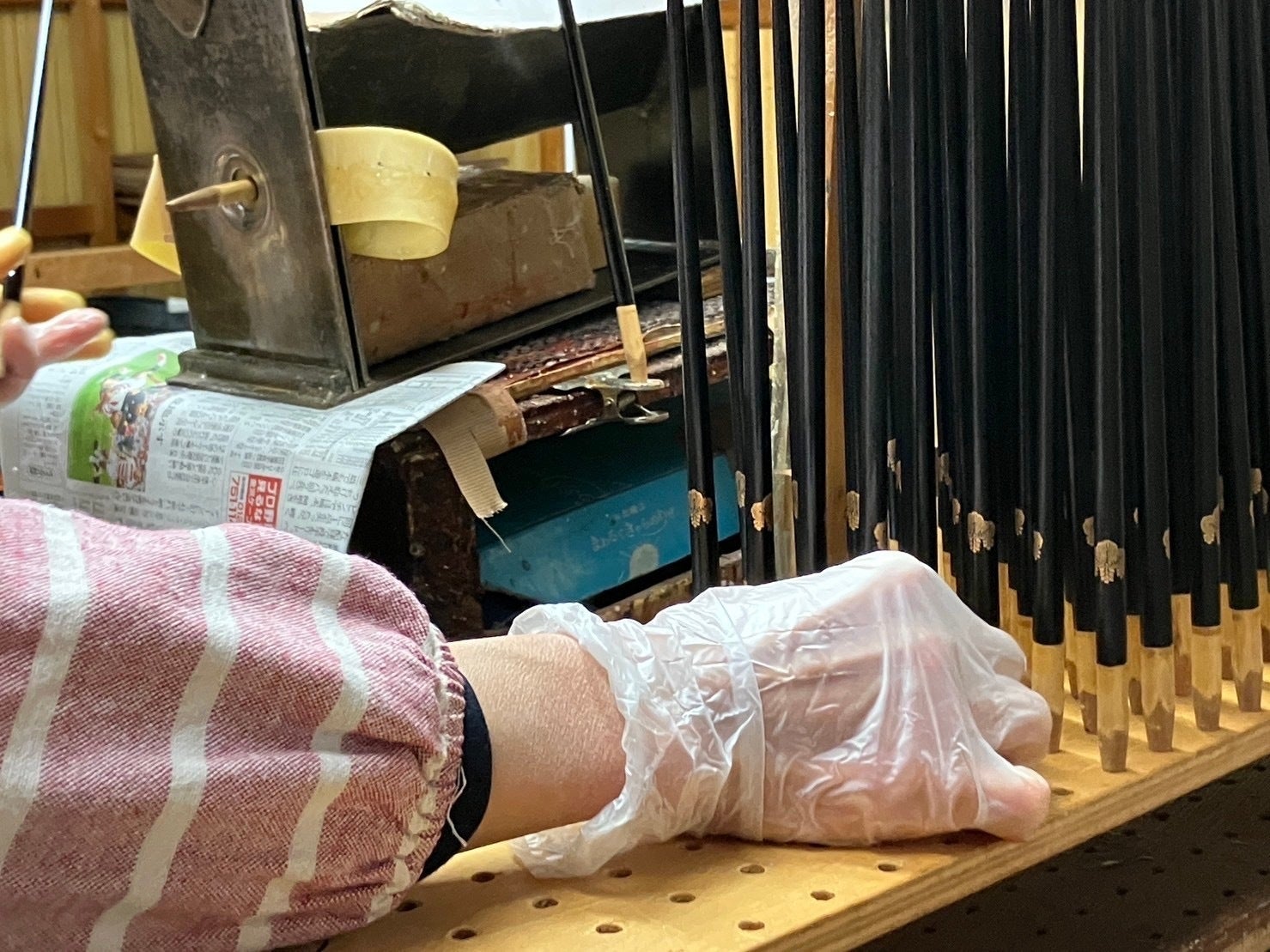 箸の頭を塗る機械です。箸づくりの一番最後の工程です。箸を逆さまにして、下から塗料をチョンチョンと付けます。今は人間の手でセットし、人間が下からチョンチョン…笑(動画は岩多箸店公式Xにて!)この機械がなかなか曲者で、震災前の通常時でも調子のいい時と悪い時がある扱いが難しい機械です。気温や湿度にも左右されますし、そもそも塗料の塩梅も難しくて、うまくいかないときは垂れたり、塗り切れていなかったりします。ひどい時はパーンと塗料が飛んでそこらじゅう…(((´ºωº`)))昔ながらの手塗りもできますが、スピードが断然違います。年間数十万膳生産していた岩多箸店にはなくてはならない重要な機械です。職人さんたちの手作業を助けてくれているこういった特注機械はそもそもとても高い機械なので1台でも買い替えになると大打撃です。。どうにか元気に直ってくれますように。