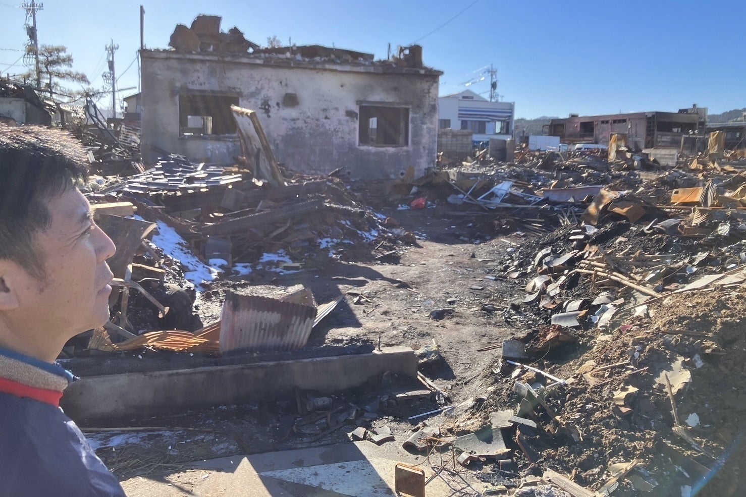 発災後初めて朝市を見に来た社長。あまりの惨状に言葉を失う。2週間経っても辺りは焼けた臭いがした。
