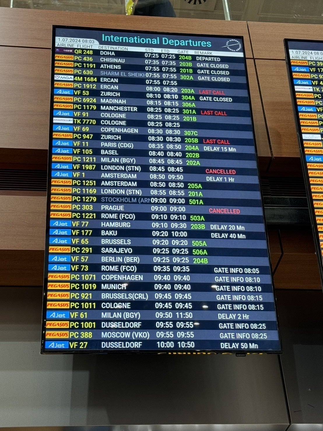 細心の注意で向かった空港で、出国審査後、搭乗口の前で「cancelled」の文字。