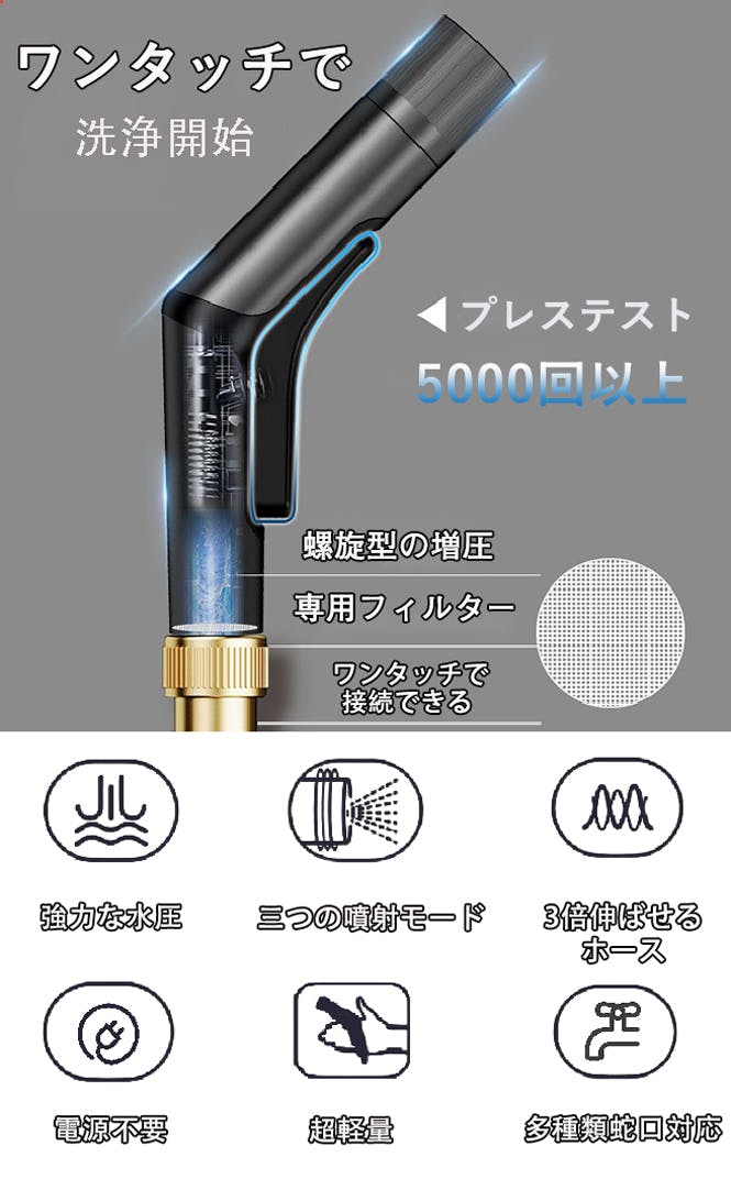 ・電気は一切不要!水道に繋げるだけで高圧洗浄が可能に。・最大3倍まで伸ばせる伸縮型ホース!収納する手間が省ける上に、ねじれにくく使いやすい。・3種類の噴射モードを切替可能!洗車・お掃除・水やりと、あらゆる場面に大活躍。
