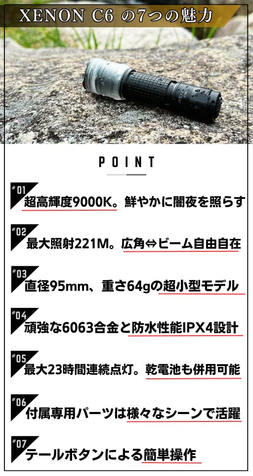 圧倒的な照射力とミニマムボディ、この実用性に優れた「XENON C6」が、サポーターの皆さまの生活を豊かにするガジェットのひとつとなれば、私たちにとってそれに勝るものはありません。