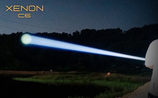 XENON C6は最大800ルーメン&9000Kという高輝度LEDユニットに加えて、独自設計の球形レンズにより、光を収束させ、より遠く、より強い光をビームのように照射します。